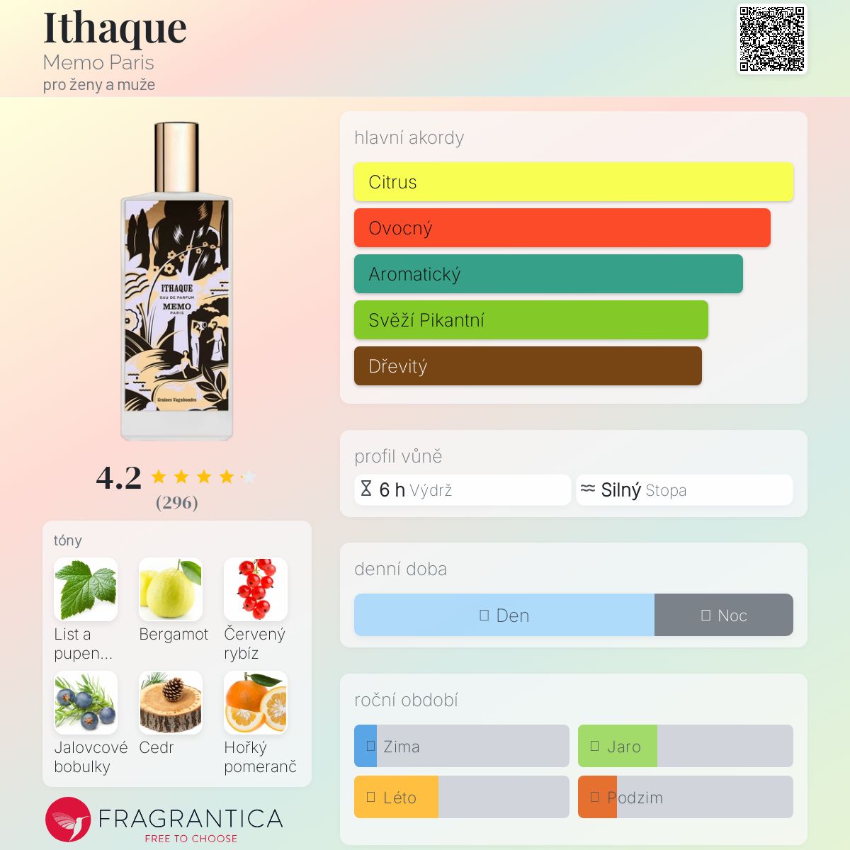 Ithaque podle Memo Paris je Chypre vůně pro ženy a muže. Ithaque byl/a uveden/a v roce 2023. "Nosem" za touto vůní je Marypierre Julien. Vrchní tóny jsou Bergamot, Hořký pomeranč, Mandarinka, Růžový pepř, Sečuánský pepř a Madagaskarský pepř; střední tóny jsouPoupata rybízu, Červený rybíz, Jalovcové bobulky, Maliny a Egyptský jasmín ; základní tóny jsou Texaský cedr a Pačuli.