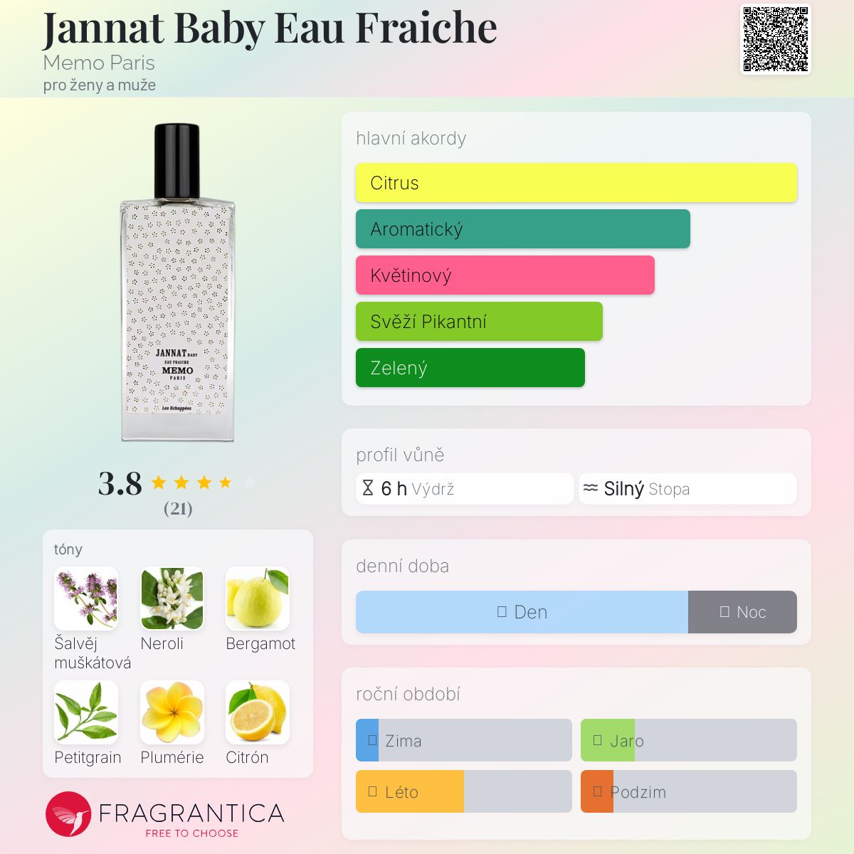 Jannat Baby Eau Fraiche podle Memo Paris je Citrus vůně pro ženy a muže. Jannat Baby Eau Fraiche byl/a uveden/a v roce 2008. "Nosem" za touto vůní je Alienor Massenet. Vrchní tóny jsou Bergamot, Petitgrain, Citrón, Pomeranč a Mandarinka; střední tóny jsouŠalvěj muškátová, Neroli a Plumérie ; základní tóny jsou Fazole tonka, Šuškarda a Pižmo.