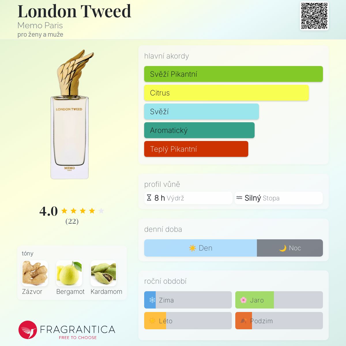 London Tweed podle Memo Paris je Aromatic Spicy vůně pro ženy a muže. London Tweed byl/a uveden/a v roce 2019. "Nosem" za touto vůní je Sophie Labbe. Vrchní tón je Bergamot ; střední tón jeZázvor ; základní tón je Kardamom.