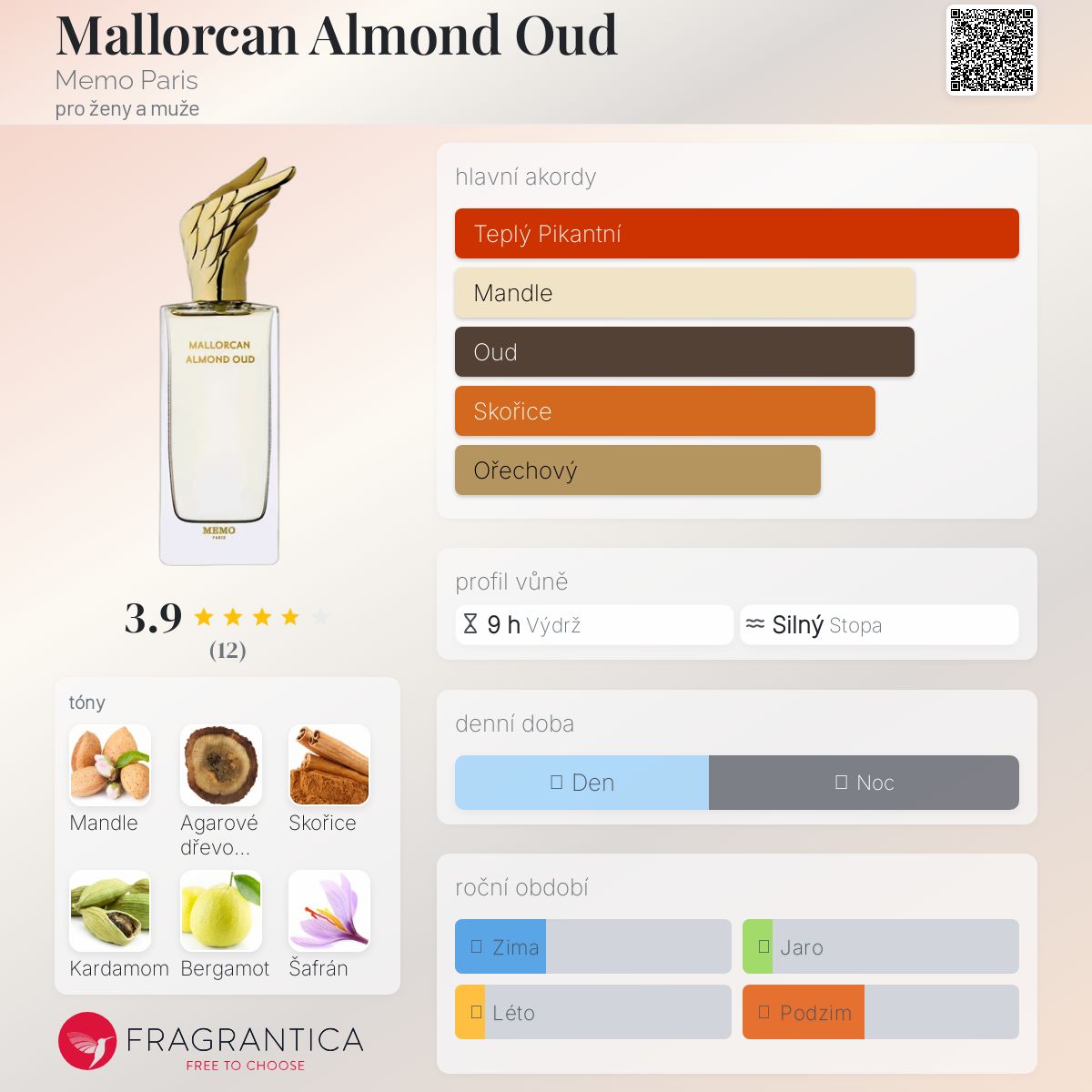 Mallorcan Almond Oud podle Memo Paris je Woody Spicy vůně pro ženy a muže. Mallorcan Almond Oud byl/a uveden/a v roce 2021. Vrchní tóny jsou Hořká mandle, Kardamom, Bergamot a Mandarinka; střední tóny jsouSkořice, Šafrán a Jasmín ; základní tóny jsou Agarové dřevo (oud), Cedr a Atlasový cedr.