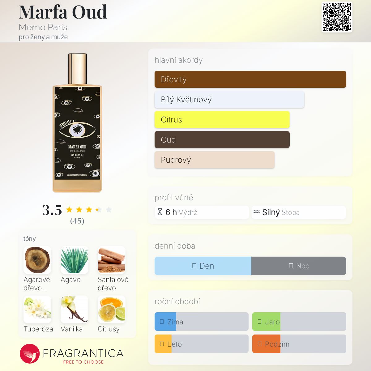 Marfa Oud podle Memo Paris je Woody Aromatic vůně pro ženy a muže. Marfa Oud byl/a uveden/a v roce 2023. "Nosem" za touto vůní je Alienor Massenet.