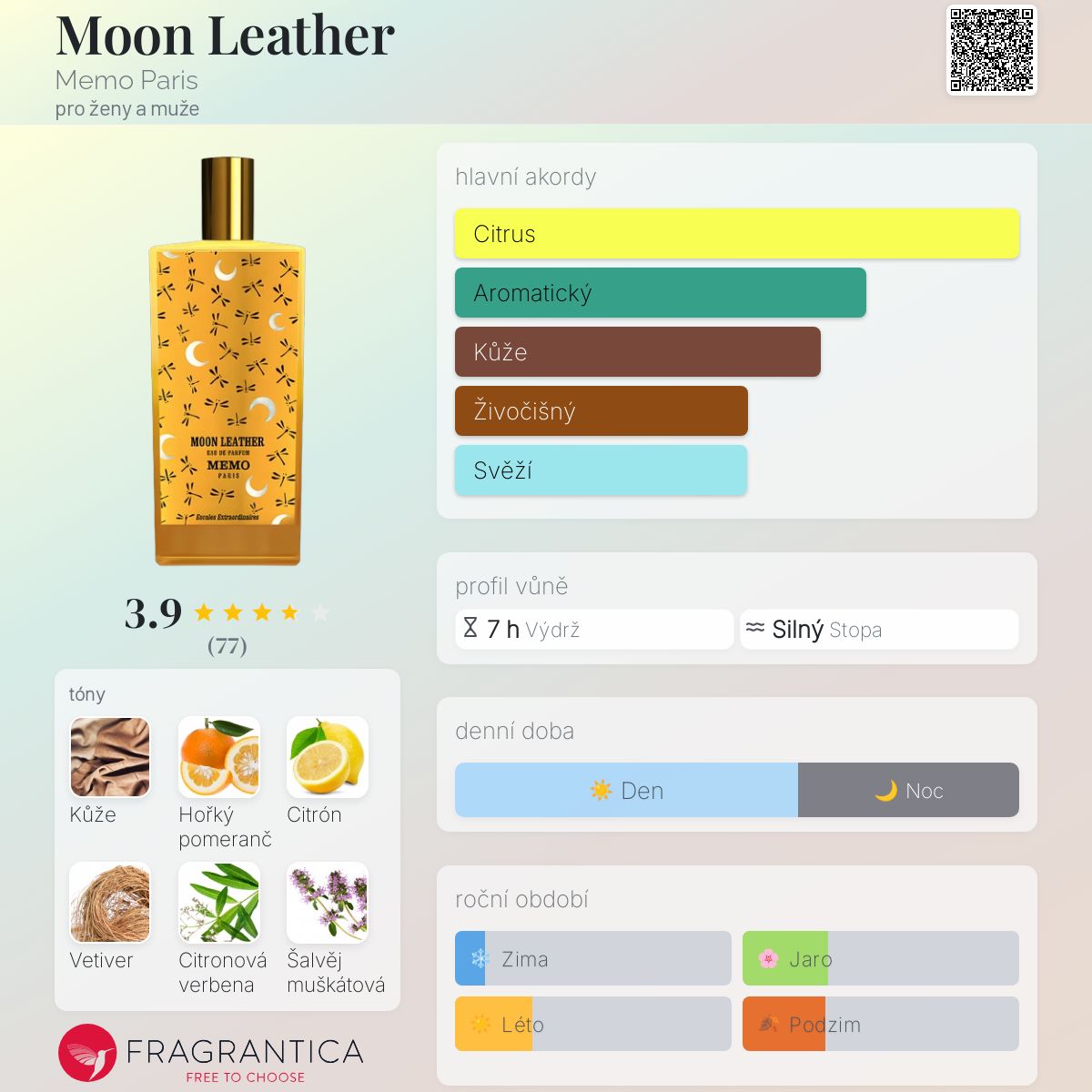 Moon Leather podle Memo Paris je Leather vůně pro ženy a muže. Moon Leather byl/a uveden/a v roce 2016. "Nosem" za touto vůní je Alienor Massenet. Vrchní tóny jsou Hořký pomeranč, Citrón a Grapefruit; střední tóny jsouCitronová verbena, Šalvěj muškátová a Neroli ; základní tóny jsou Kůže, Vetiver a Fazole tonka.