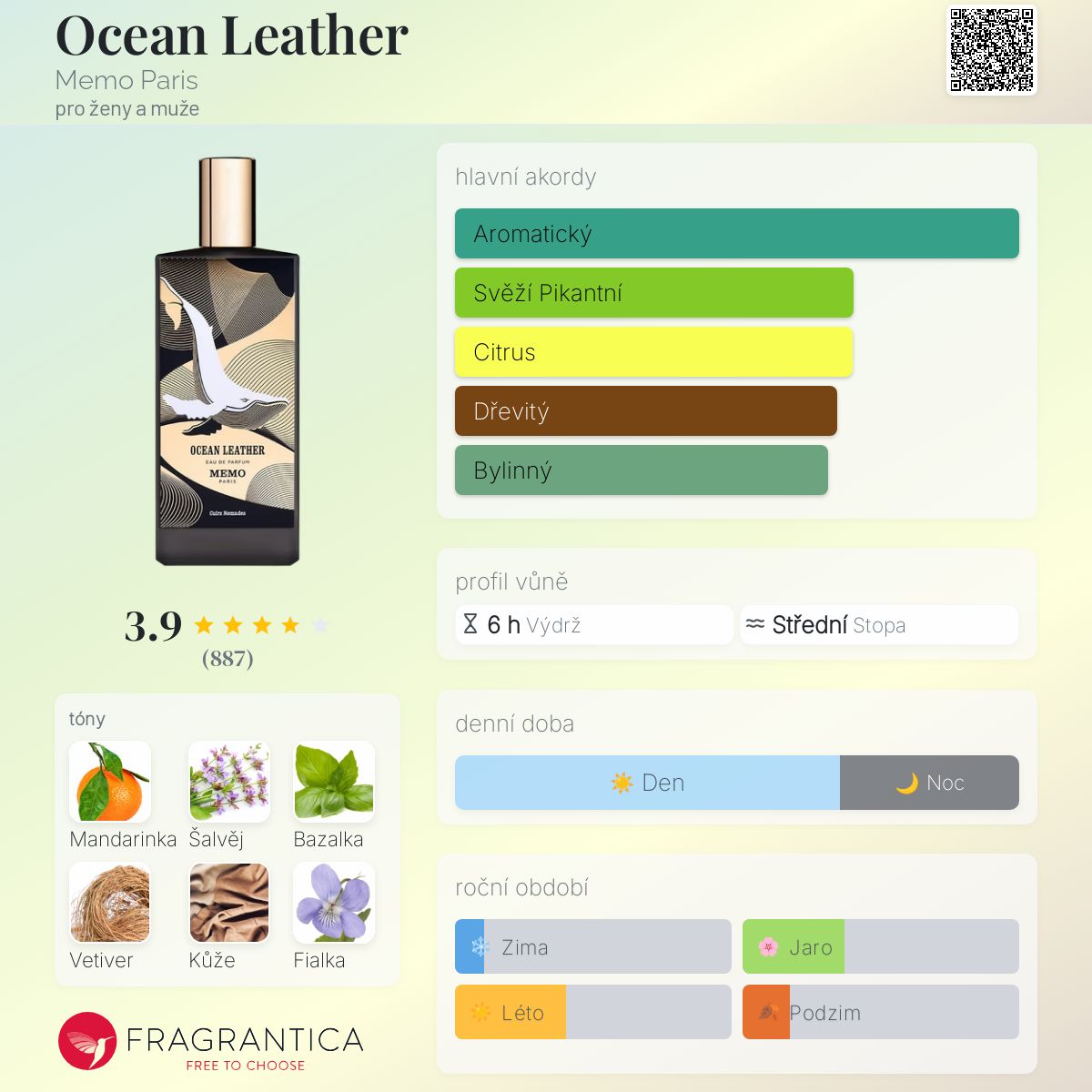 Ocean Leather podle Memo Paris je Leather vůně pro ženy a muže. Ocean Leather byl/a uveden/a v roce 2020. "Nosem" za touto vůní je Alienor Massenet. Vrchní tóny jsou Mandarinka, Bazalka a Fialka; střední tóny jsouŠalvěj, Elimi a Cedr ; základní tóny jsou Vetiver, Kůže a Muškátový oříšek.