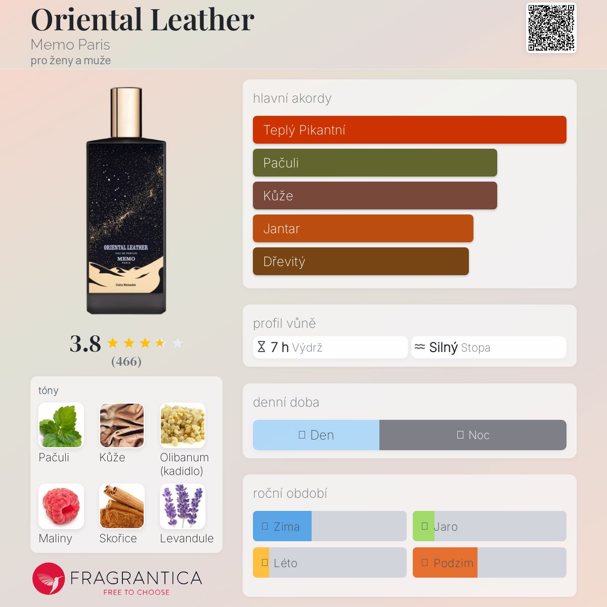 Oriental Leather podle Memo Paris je Leather vůně pro ženy a muže. Oriental Leather byl/a uveden/a v roce 2019. "Nosem" za touto vůní je Alienor Massenet. Vrchní tóny jsou Maliny, List jamajského pepře a Sporýš; střední tóny jsouSkořice, Levandule a Pelargónie ; základní tóny jsou Pačuli, Kůže a Olibanum.