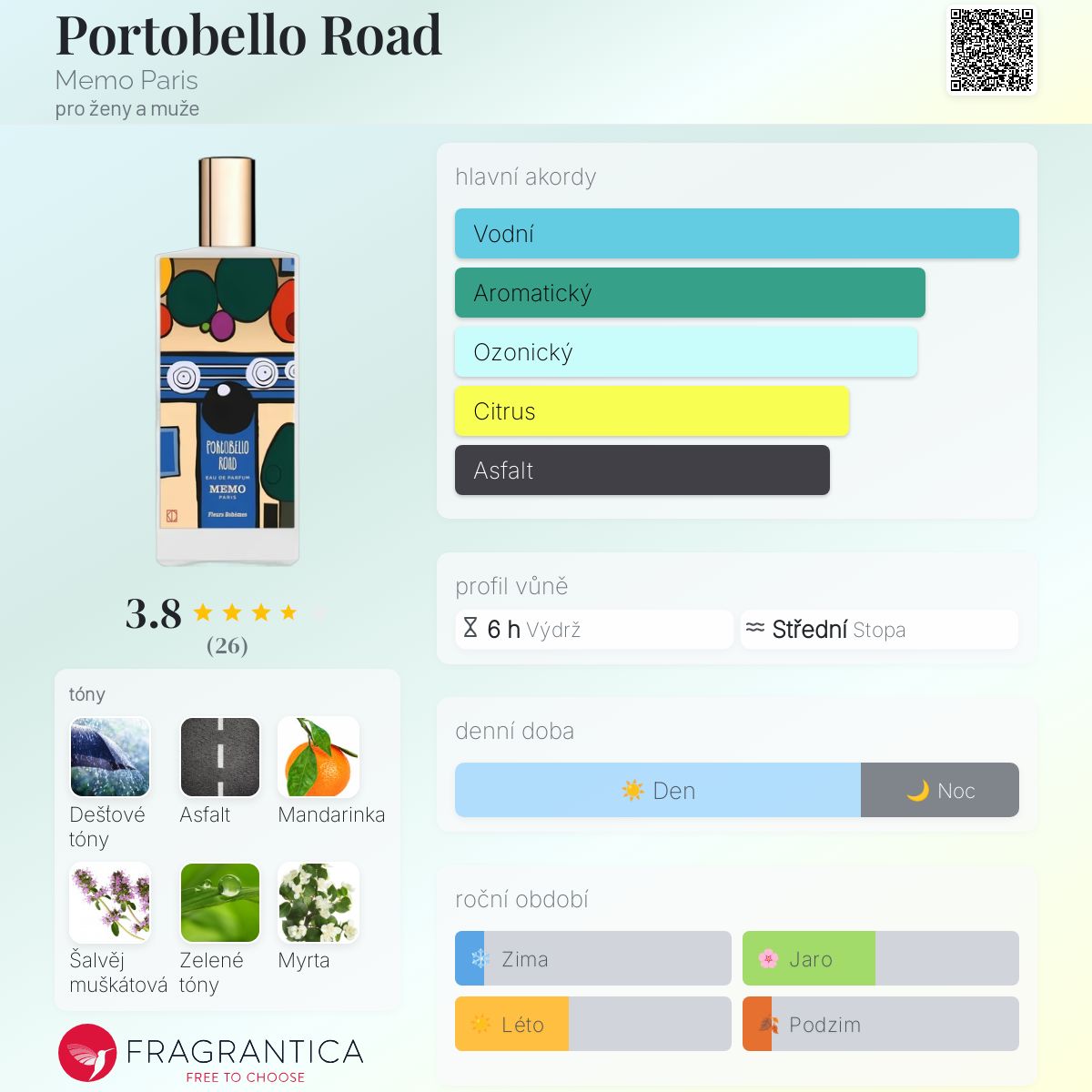 Portobello Road podle Memo Paris je Floral Green vůně pro ženy a muže. Toto je nová vůně. Portobello Road byl/a uveden/a v roce 2025. "Nosem" za touto vůní je Alienor Massenet. Vrchní tóny jsou Mandarinka, Zelené listí a Myrta; střední tóny jsouŠalvěj muškátová a Růže ; základní tóny jsou Dešťové tóny, Asfalt, Pačuli a Vetiver.