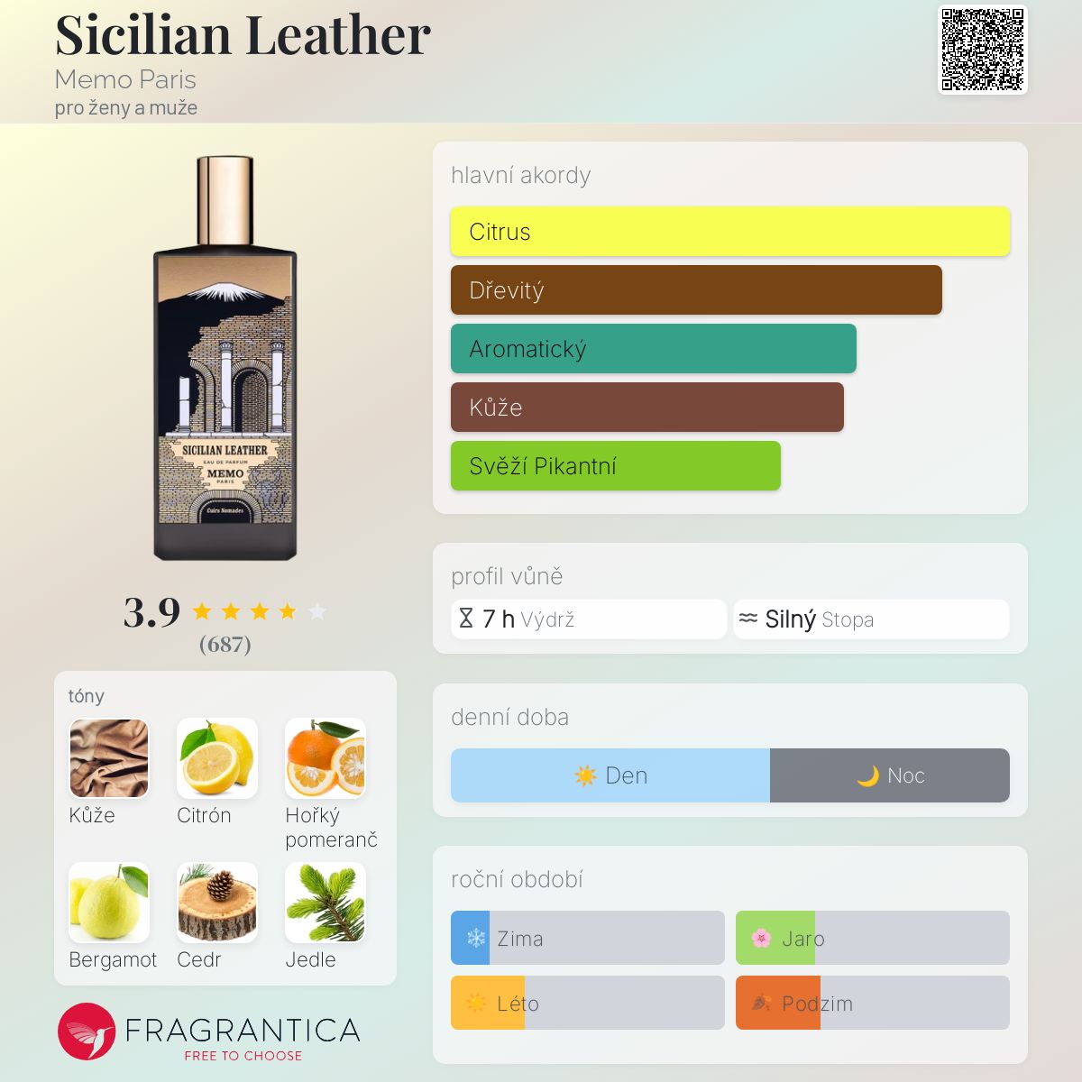 Sicilian Leather podle Memo Paris je Leather vůně pro ženy a muže. Sicilian Leather byl/a uveden/a v roce 2021. Vrchní tóny jsou Kůže, Citrón, Hořký pomeranč a Cedr; střední tóny jsouBergamot, Limetka, Kardamom, Koriandr a Fialkový list ; základní tóny jsou Jedle balzámová, Guajakové dřevo, Dřevo akigala a Pačuli.