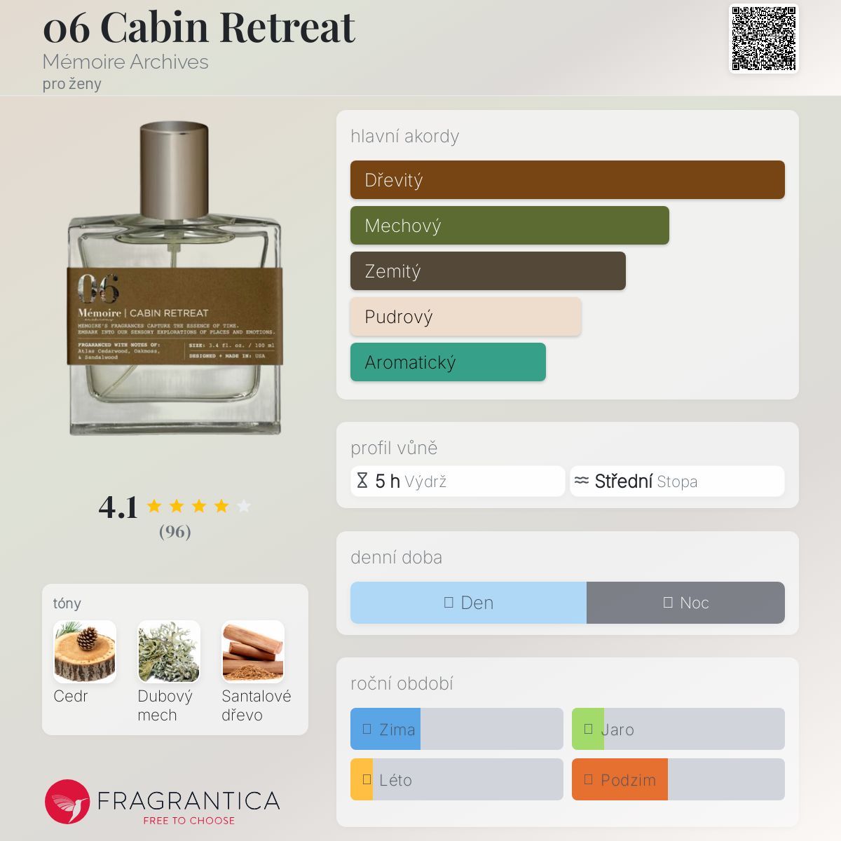 06 Cabin Retreat podle Mémoire Archives je Woody vůně pro ženy. 06 Cabin Retreat byl/a uveden/a v roce 2020. Vrchní tón je Cedr ; střední tón jeDubový mech ; základní tón je Santalové dřevo.