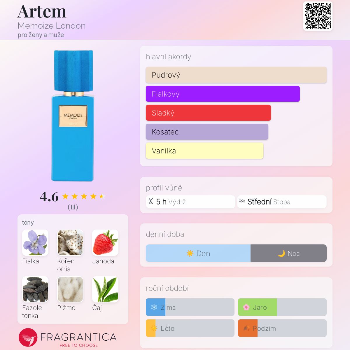 Artem podle Memoize London je Floral Fruity vůně pro ženy a muže. Artem byl/a uveden/a v roce 2022. Vrchní tóny jsou Fialka a Čaj; střední tóny jsouKořen orris a Fazole tonka ; základní tóny jsou Jahoda, Pižmo a Vanilka.