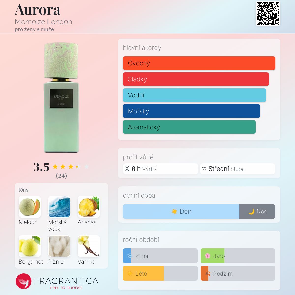 Aurora podle Memoize London je Floral Fruity vůně pro ženy a muže. Toto je nová vůně. Aurora byl/a uveden/a v roce 2024. Vrchní tóny jsou Mořské tóny a Bergamot; střední tóny jsouMeloun, Ananas, Jasmín, Rebarbora a Cypřiš ; základní tóny jsou Pižmo, Vanilka, Santalové dřevo, Cedr a Jantar (ambra).