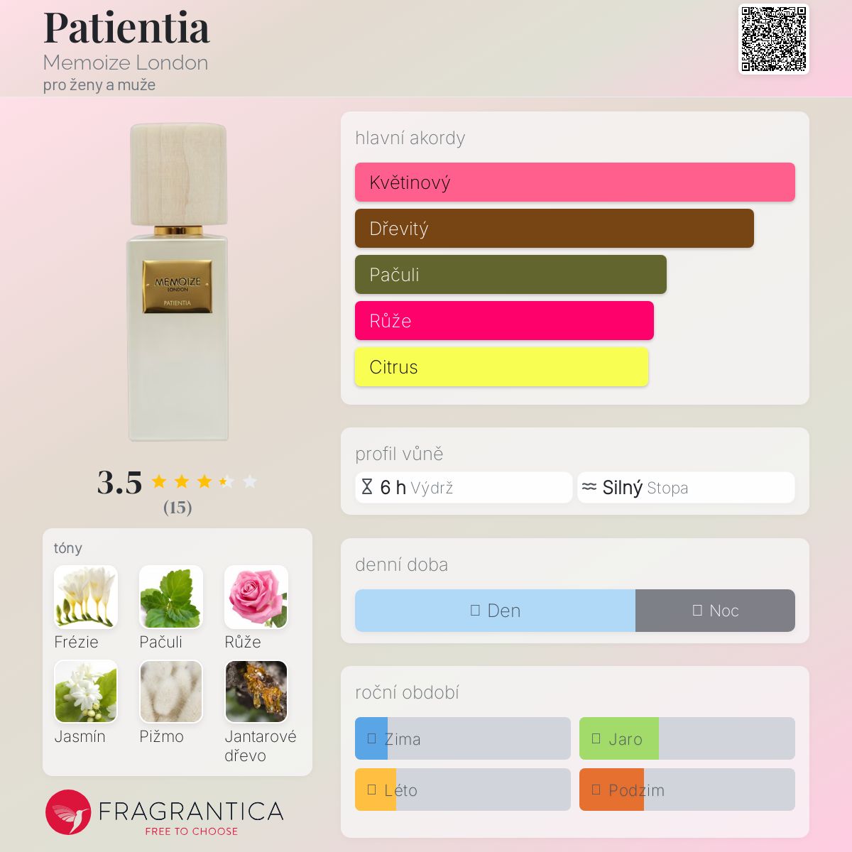 Patientia podle Memoize London je Orientální Floral vůně pro ženy a muže. Patientia byl/a uveden/a v roce 2019. Vrchní tóny jsou Turecká růže, Jasmín, Mandarinka a Bergamot; střední tóny jsouFrézie, Orchidej a Mech ; základní tóny jsou Pačuli, Bílé pižmo, Jantarové dřevo a Santalové dřevo.