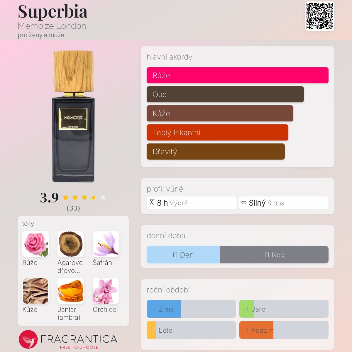 Superbia podle Memoize London je Orientální Woody vůně pro ženy a muže. Superbia byl/a uveden/a v roce 2018. Vrchní tóny jsou Růže, Orchidej a Ylang-Ylang; střední tóny jsouŠafrán, Santalové dřevo a Cedr ; základní tóny jsou Agarové dřevo (oud), Kůže, Jantar (ambra), Pačuli a Pižmo.