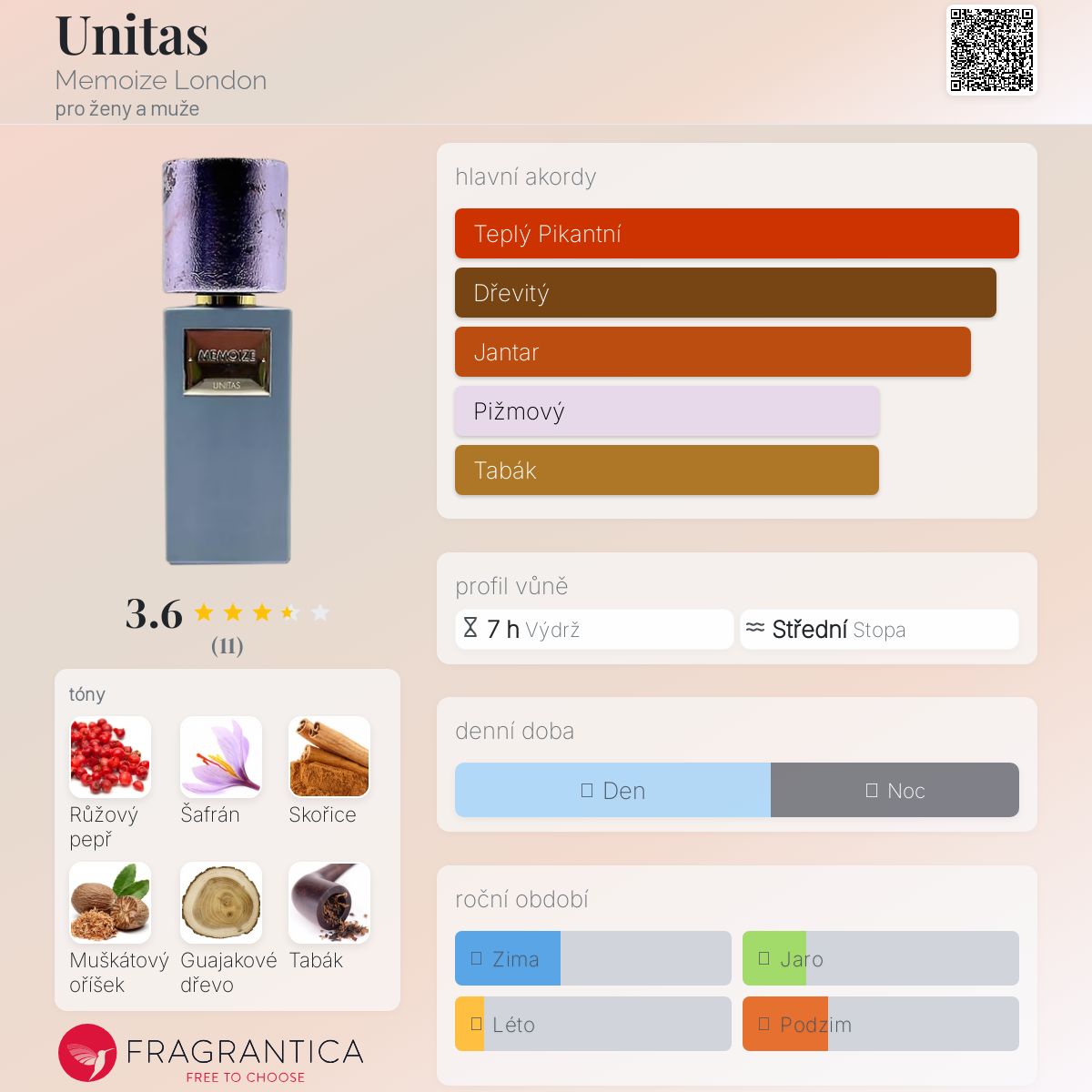 Unitas podle Memoize London je vůně pro ženy a muže. Unitas byl/a uveden/a v roce 2022. Vrchní tóny jsou Růžový pepř, Šafrán, Skořice a Muškátový oříšek; střední tóny jsouRůže, Egyptský jasmín a Davana ; základní tóny jsou Guajakové dřevo, Tabák, Vanilka, Kadidlo, Jantar (ambra), Pižmo, Cypriolový olej, Vetiver a Pačuli.