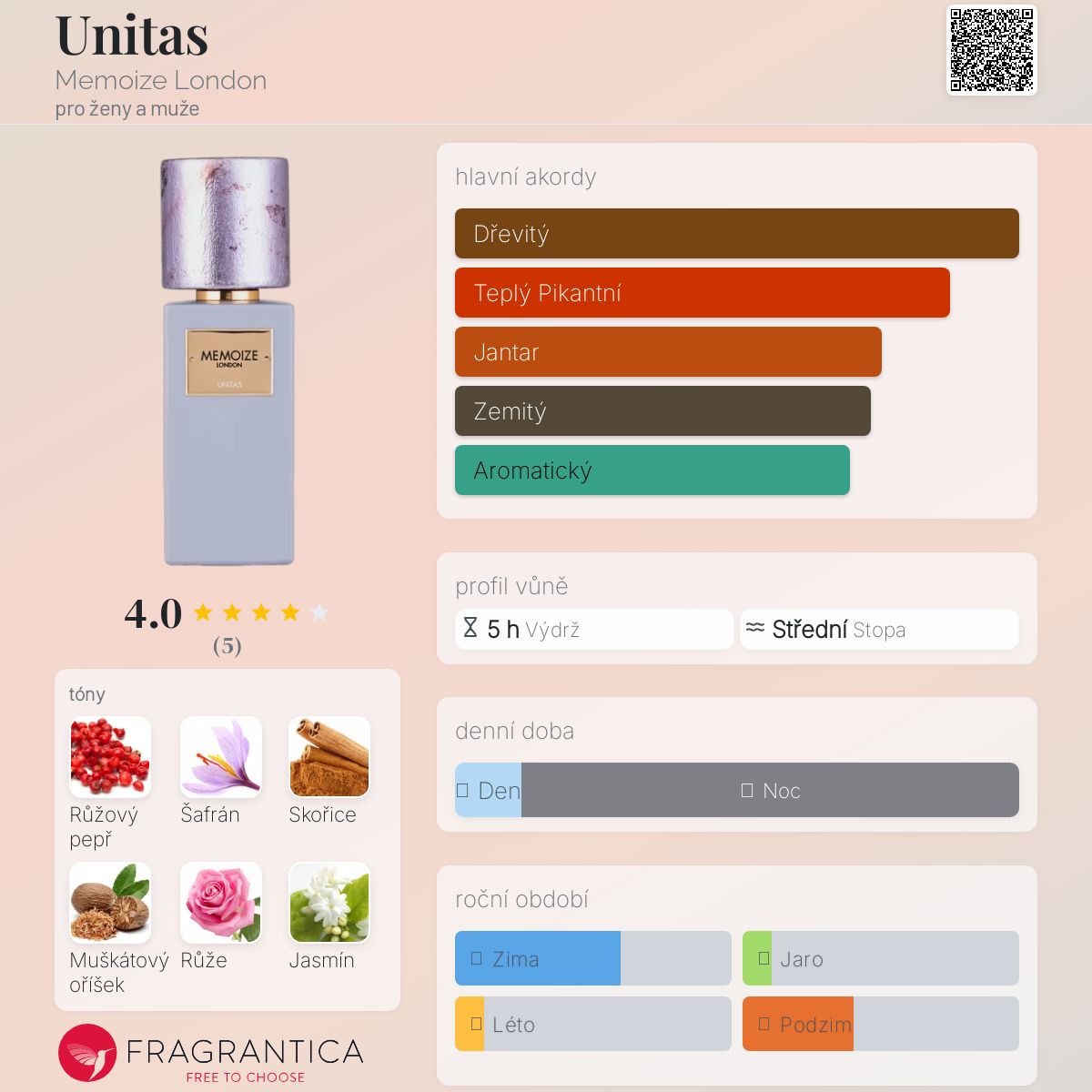 Unitas podle Memoize London je Orientální Spicy vůně pro ženy a muže. Unitas byl/a uveden/a v roce 2022. Vrchní tóny jsou Růžový pepř, Šafrán, Skořice a Muškátový oříšek; střední tóny jsouRůže, Egyptský jasmín a Davana ; základní tóny jsou Vetiver, Guajakové dřevo, Pačuli, Cypriolový olej, Tabák, Vanilka, Kadidlo, Jantar (ambra) a Pižmo.