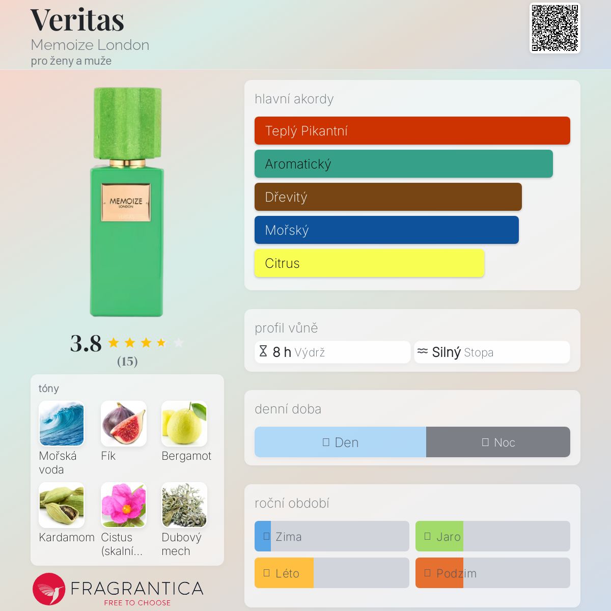 Veritas podle Memoize London je Floral Fruity vůně pro ženy a muže. Veritas byl/a uveden/a v roce 2022. "Nosem" za touto vůní je Tristan Badard. Vrchní tóny jsou Fík, Bergamot a Kokos; střední tóny jsouMořské tóny, Kardamom a Skalní růže ; základní tóny jsou Mech, Šafrán, Santalové dřevo a Pižmo.