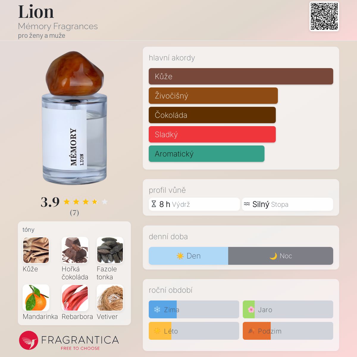Lion podle Mémory Fragrances je Orientální Woody vůně pro ženy a muže. Toto je nová vůně. Lion byl/a uveden/a v roce 2025. "Nosem" za touto vůní je Kevin Mathys. Vrchní tóny jsou Mandarinka, Rebarbora a Rozmarýn; střední tóny jsouMléčná čokoláda, Vetiver a Cedr ; základní tóny jsou Kůže, Fazole tonka a Amyris.