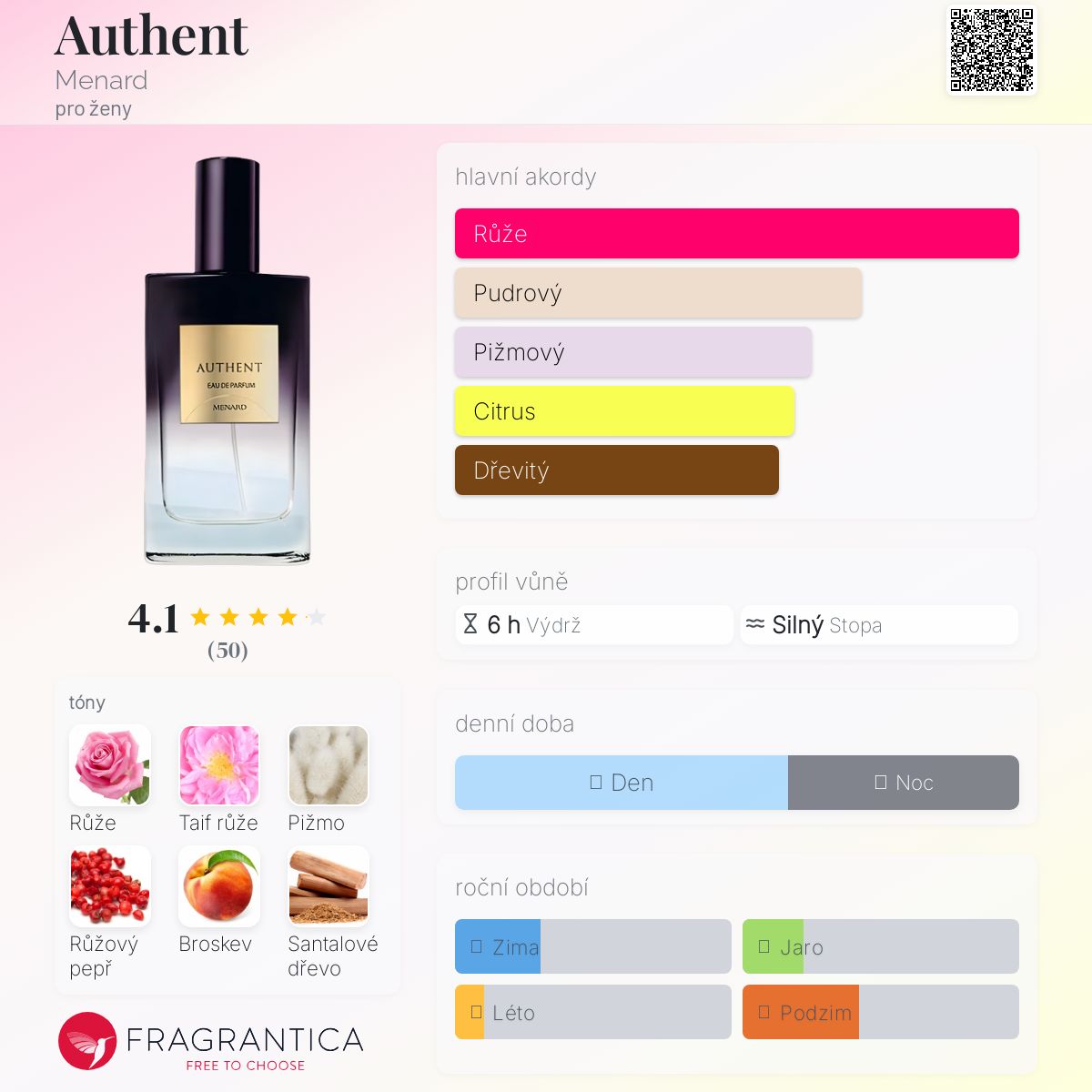 Authent podle Menard je Floral vůně pro ženy. Authent byl/a uveden/a v roce 2012. Vrchní tóny jsou Růže, Růžový pepř, Broskev, Bergamot a Fialkový list; střední tóny jsouTaif růže, Neroli a Jasmín ; základní tóny jsou Pižmo, Santalové dřevo a Vanilka.