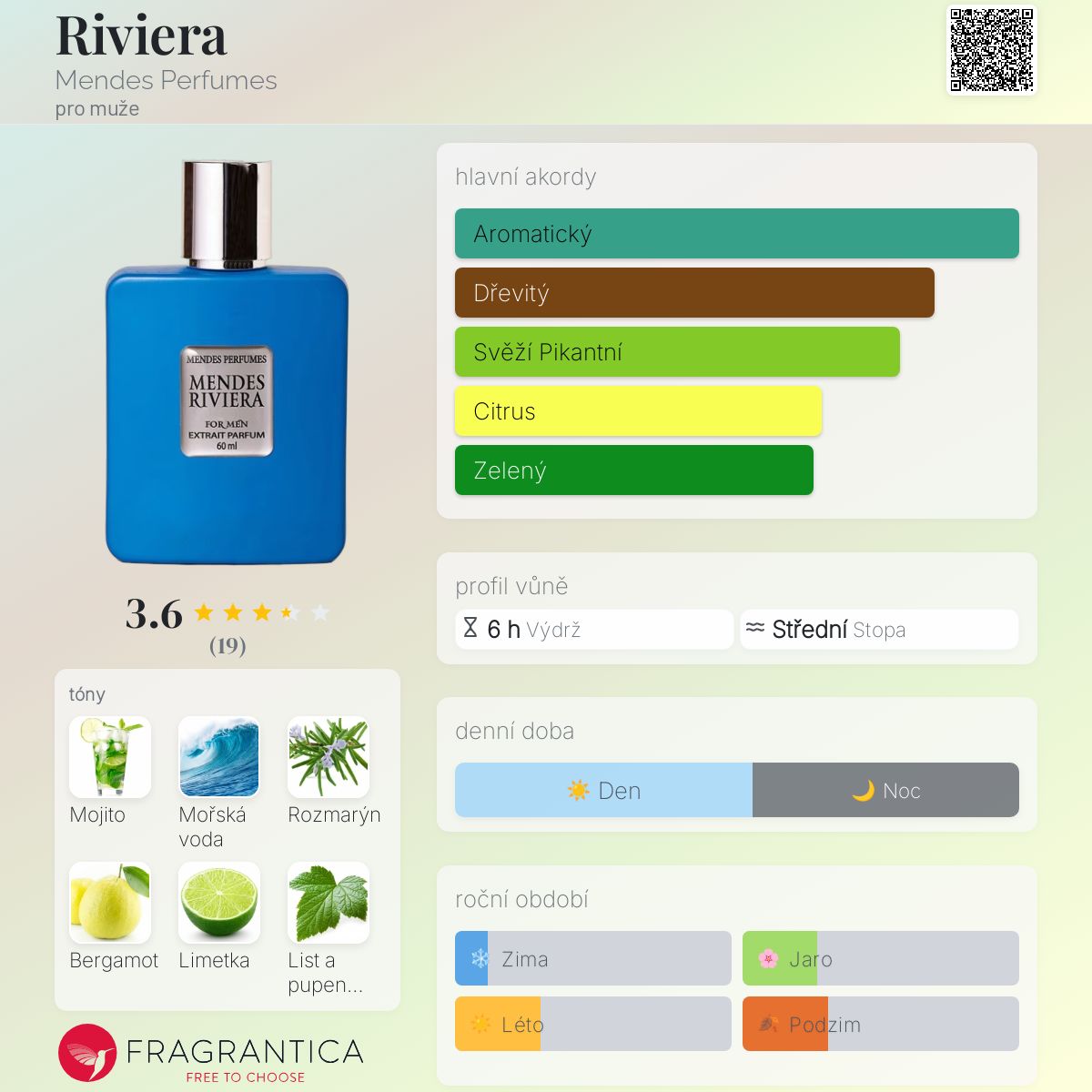 Riviera podle Mendes Perfumes je Woody Spicy vůně pro muže. Riviera byl/a uveden/a v roce 2023. "Nosem" za touto vůní je Dominique Preyssas. Vrchní tóny jsou Bergamot, Limetka, Černý rybíz, Pikantní máta, Růžový pepř a Černý pepř; střední tóny jsouMojito, Mořské tóny, Rozmarýn, Cypřiš, Jasmín Sambac, Pelargónie, Levandule a Kardamom ; základní tóny jsou Kořen orris, Pačuli, Vetiver, Cedr, Dub, Olibanum, Jantar (ambra), Pižmo a Tabák.
