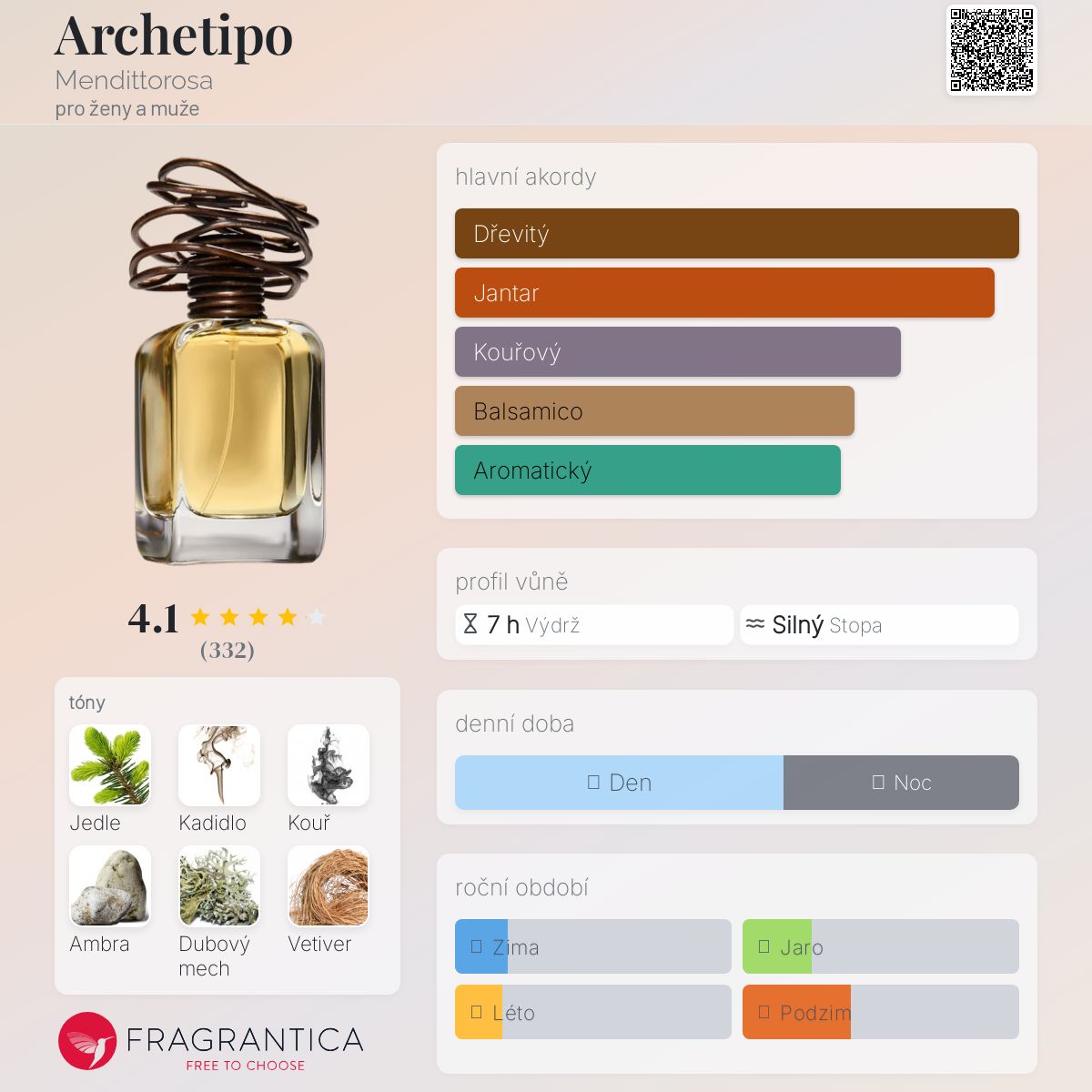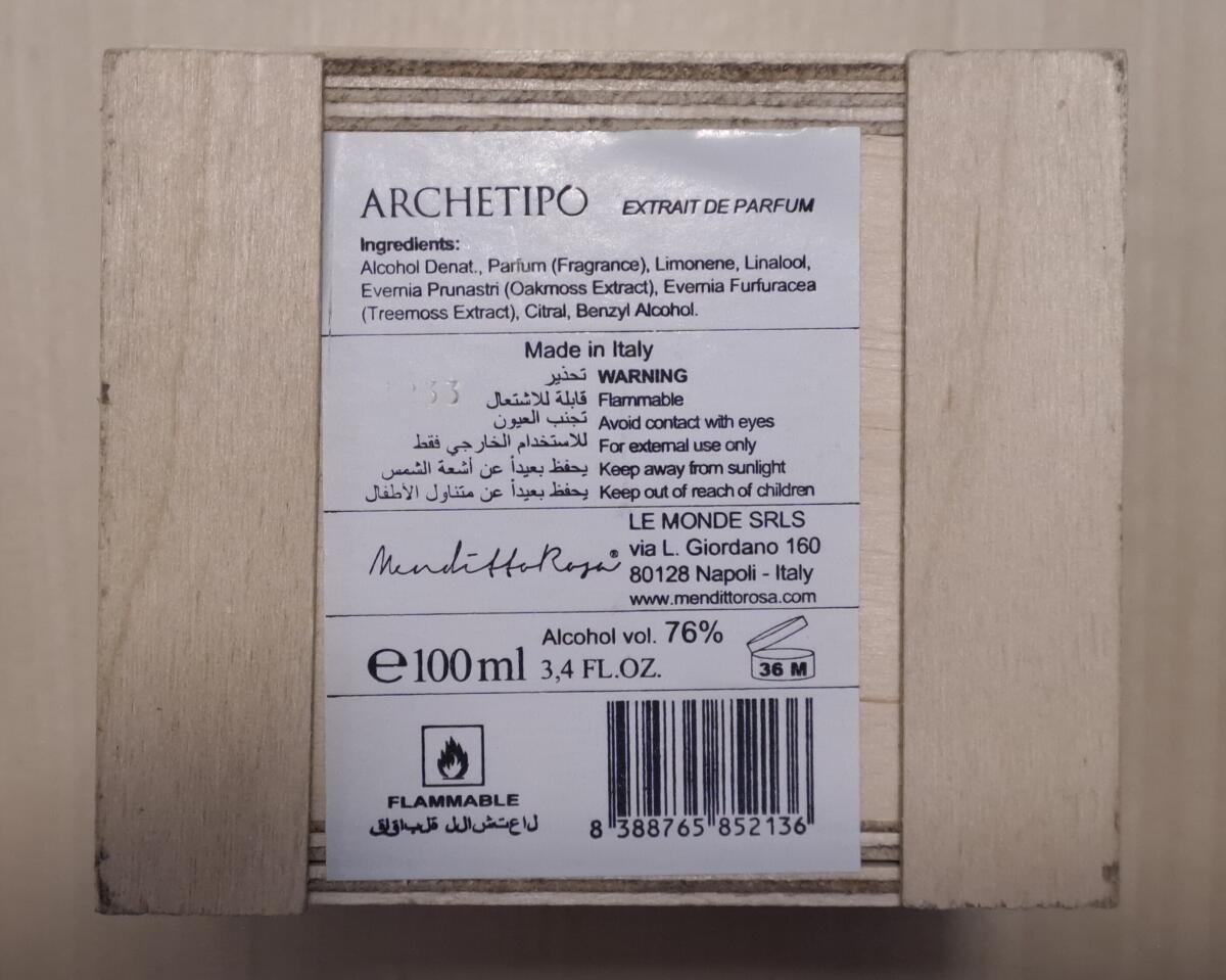 Archetipo podle Mendittorosa je Woody vůně pro ženy a muže. Archetipo byl/a uveden/a v roce 2017. "Nosem" za touto vůní je Luca Maffei. Vrchní tóny jsou Jedle balzámová, Kadidlo a Růžový pepř; střední tón jeKouř ; základní tóny jsou Černý jantar, Dubový mech, Vetiver, Labdanum, Kašmírové dřevo a Pačuli.
