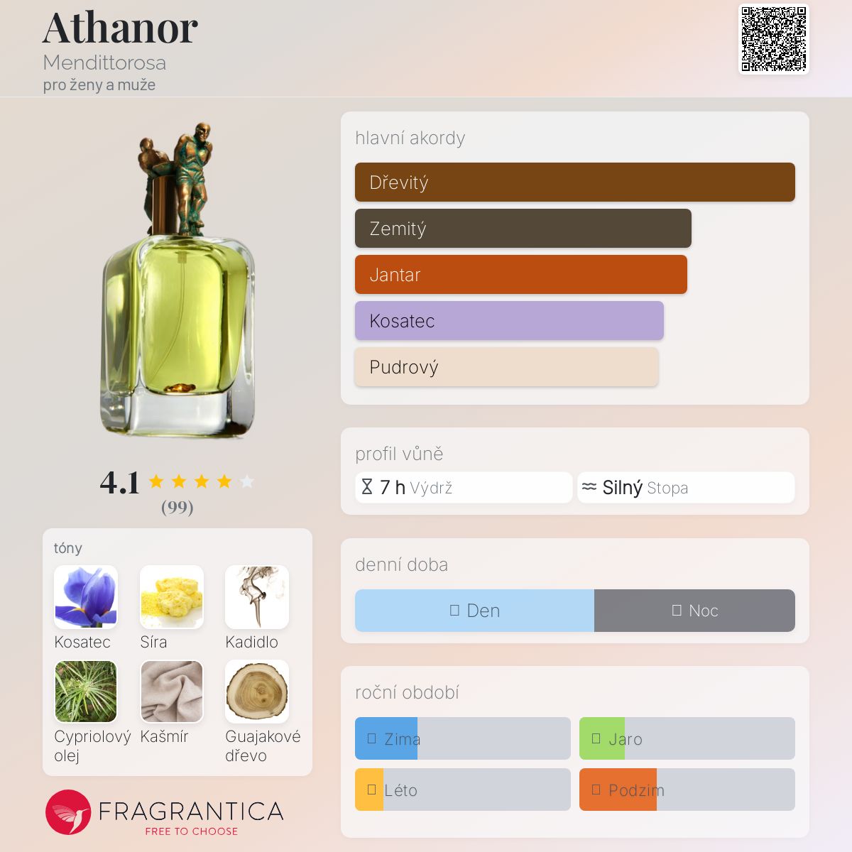Athanor podle Mendittorosa je vůně pro ženy a muže. Athanor byl/a uveden/a v roce 2020. "Nosem" za touto vůní je Luca Maffei. Vrchní tóny jsou Síra, Černý rybíz a Šafrán; střední tóny jsouKosatec, Kadidlo a Cypriolový olej ; základní tóny jsou Kašmír, Guajakové dřevo, Java vetiverový olej a Černý jantar.