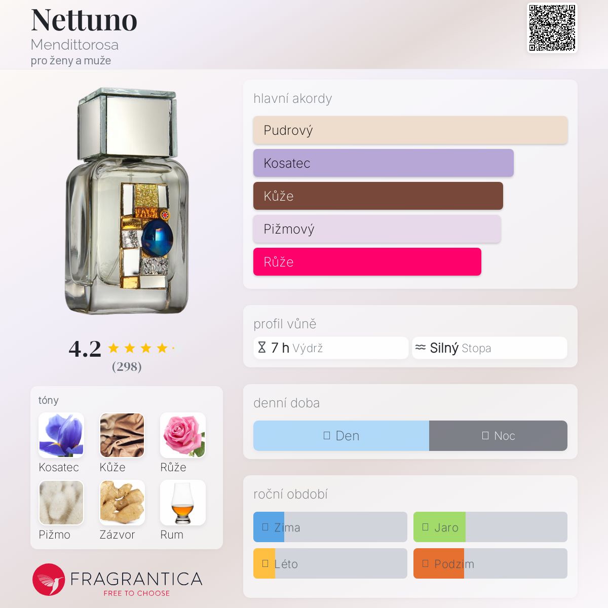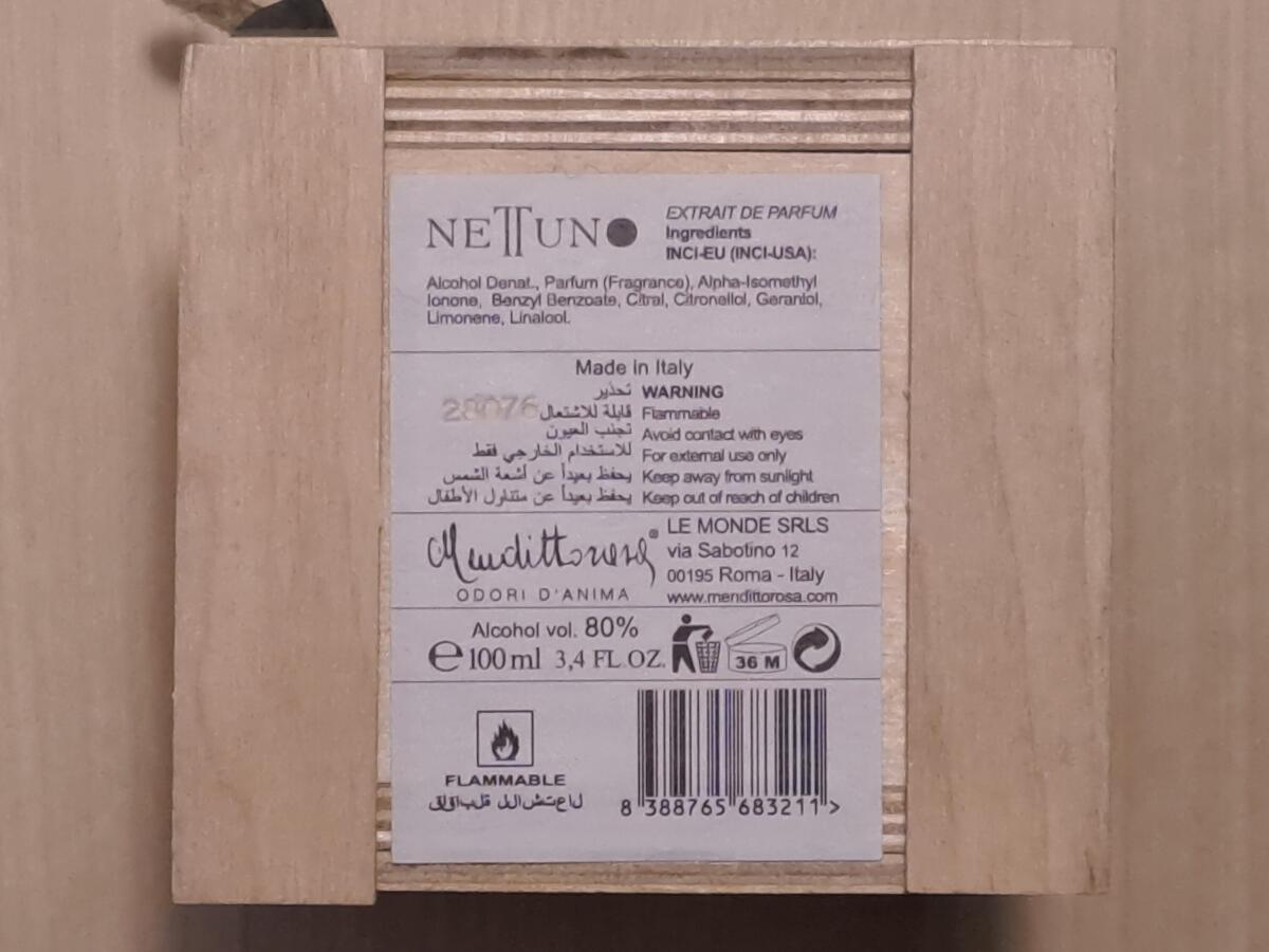 Nettuno podle Mendittorosa je vůně pro ženy a muže. Nettuno byl/a uveden/a v roce 2016. "Nosem" za touto vůní je Amelie Bourgeois. Vrchní tóny jsou Zázvor, Brambořík, Muškátový oříšek a Růžový pepř; střední tón jeRůže ; základní tóny jsou Kosatec, Kůže, Bílé pižmo, Rum, Haitský vetiver, Semena mrkve a Benzoin.
