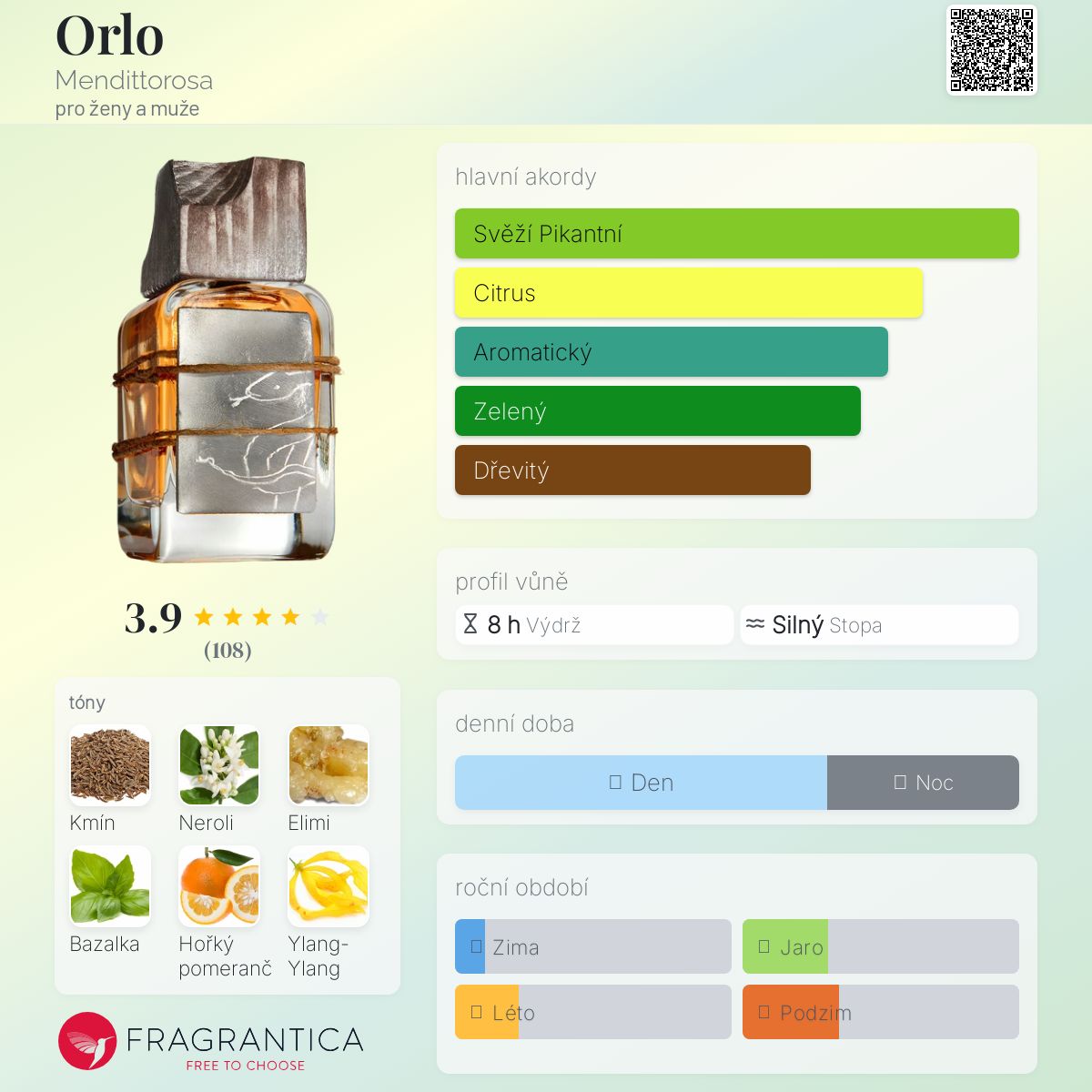 Orlo podle Mendittorosa je vůně pro ženy a muže. Orlo byl/a uveden/a v roce 2020. "Nosem" za touto vůní je Anne-Sophie Behaghel. Vrchní tóny jsou Bazalka, Hořký pomeranč, Mandarinka a Bergamot; střední tóny jsouKmín, Neroli, Elimi, Ylang-Ylang, Petitgrain, Kardamom, Růžový pepř a Levandule ; základní tóny jsou Kůže, Papyrus, Seno, Rum, Agarové dřevo (oud) a Šafrán.
