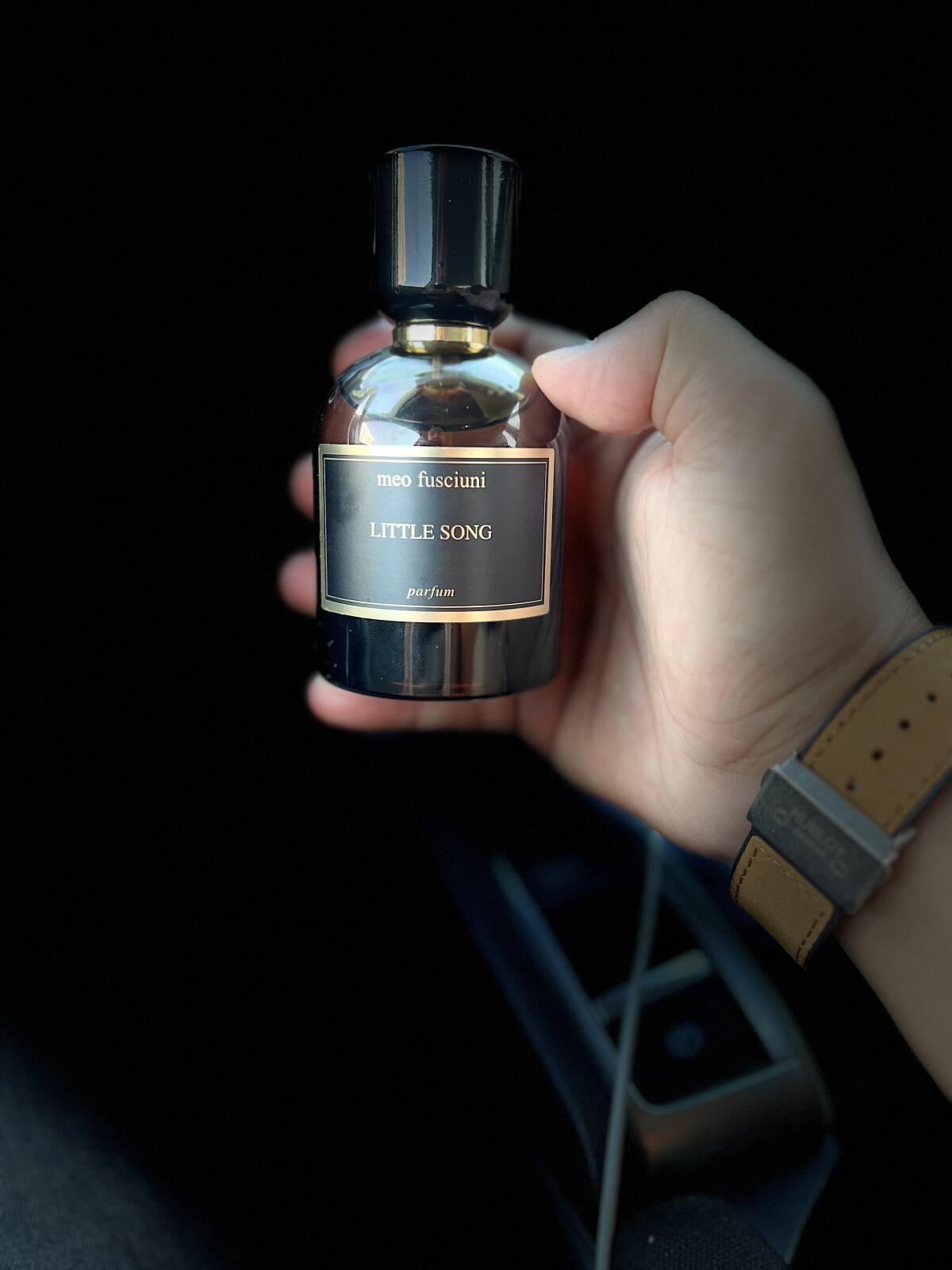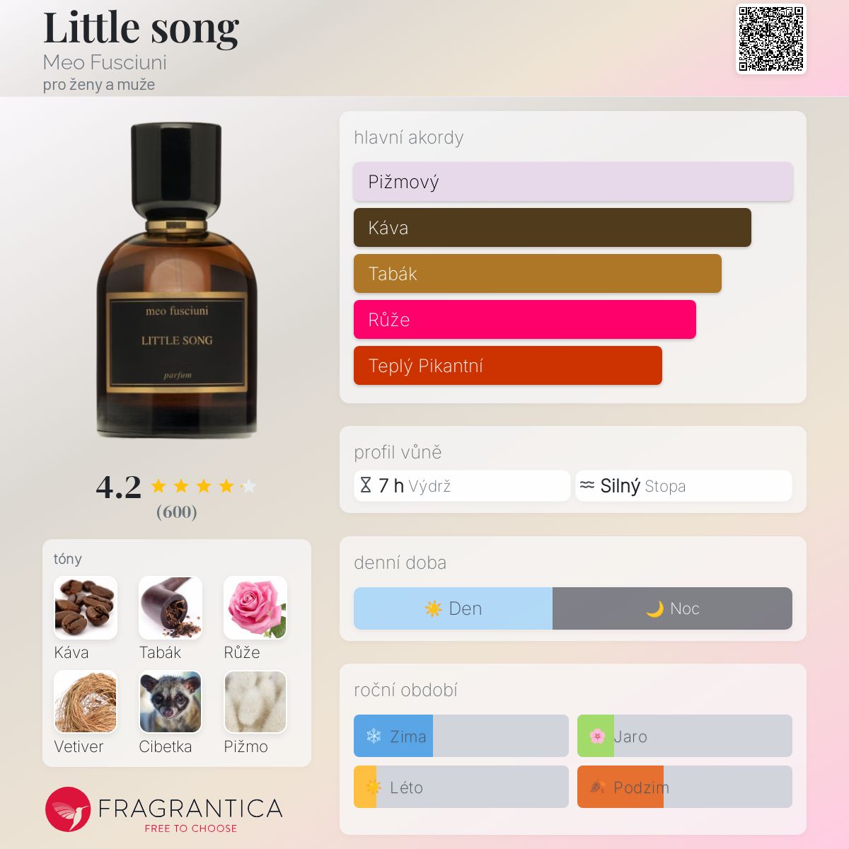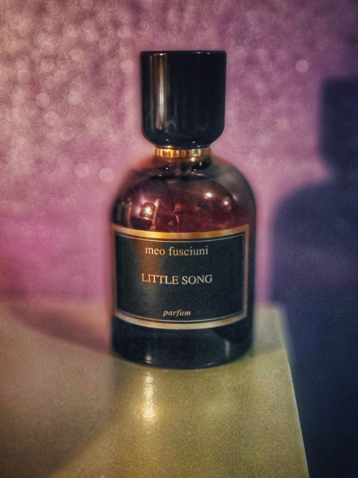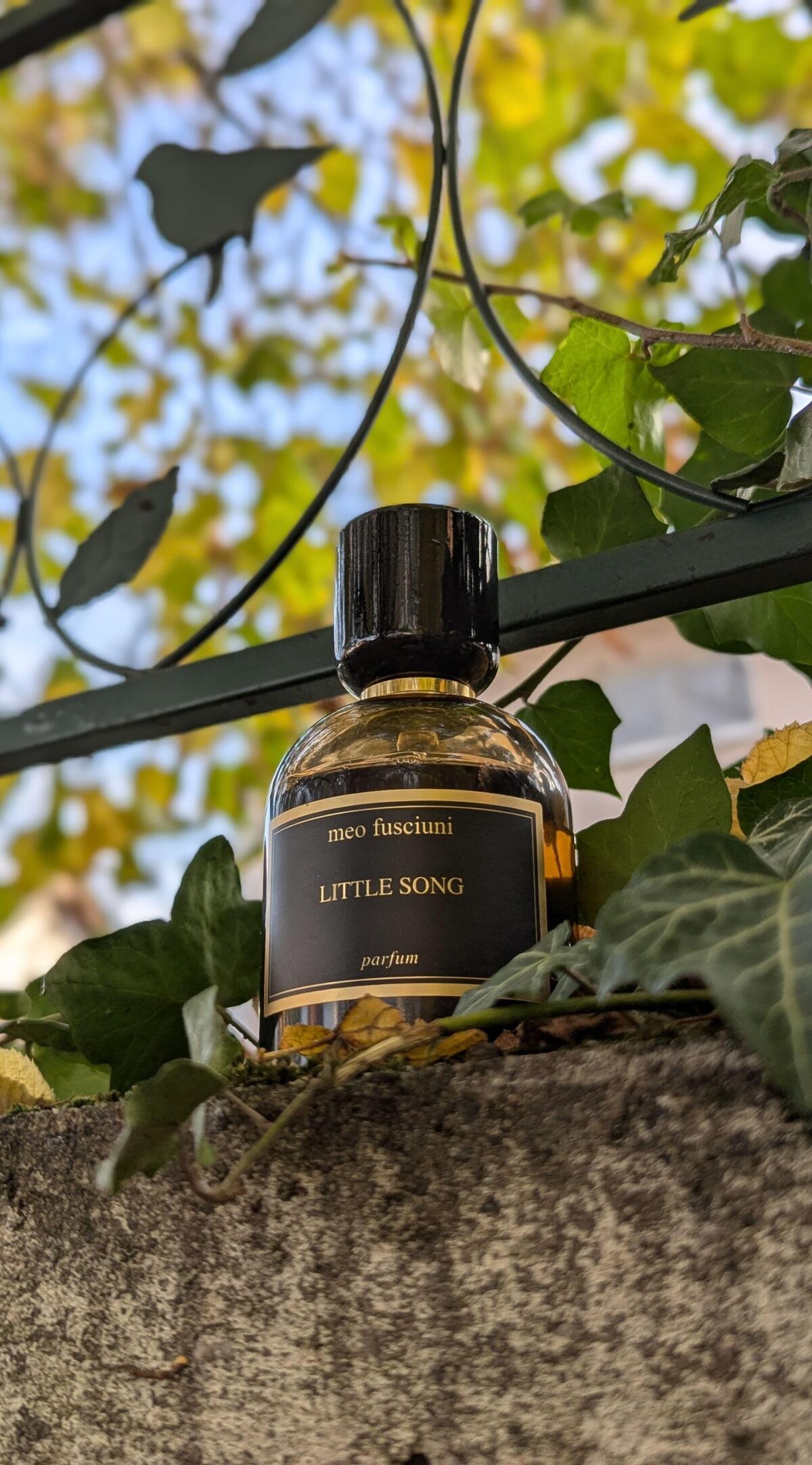 Little song podle Meo Fusciuni je vůně pro ženy a muže. Little song byl/a uveden/a v roce 2018. "Nosem" za touto vůní je Giuseppe Imprezzabile. Vrchní tóny jsou Růžový pepř, Zázvor a Bergamot; střední tóny jsouKáva, Turecký růžový olej a Šuškarda ; základní tóny jsou Tabák, Cibetka, Bourbonský vetiver, Pižmo, Labdanum a Šalvěj.