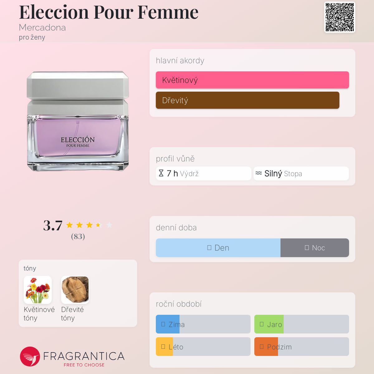 Eleccion Pour Femme podle Mercadona je Floral vůně pro ženy. Eleccion Pour Femme byl/a uveden/a v roce 2009.