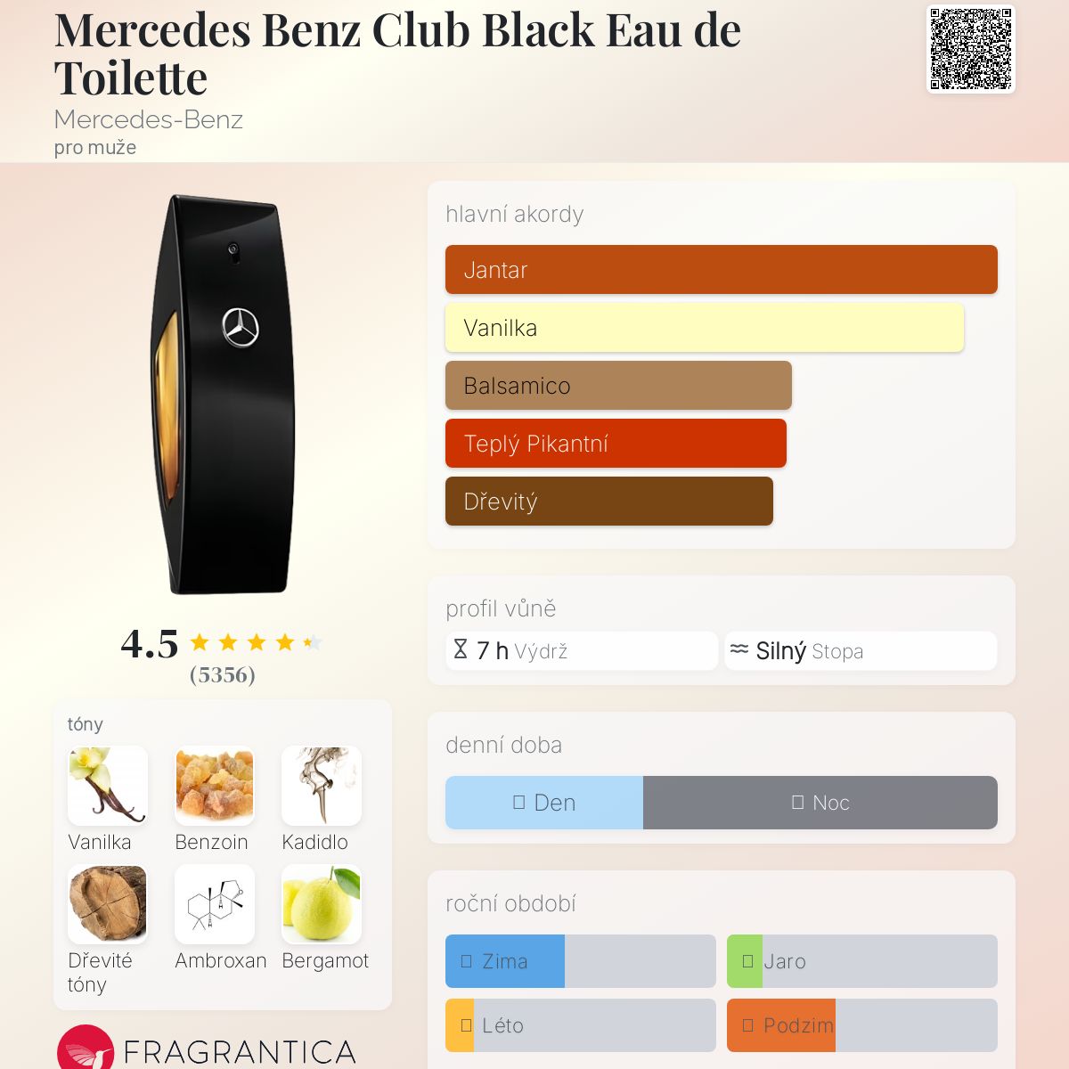 Už dlouho jsem si chtěla koupit nějakou pěknou sladkou vanilkovou vůni za slušnou cenu, rozhodla jsem se pro tuto vůni. Mnoho lidí možná odradí fakt, že jde o Mercedes-Benz, a dokonce i název "Club Black", a pak si mimovolně vzpomenou na nějakou klubovou vůni, jako je Versace Eros, Paco Rabanne One Million nebo Jean-Paul Gaultier Ultra Male. Vůně však není tak jednoduchá, jak se na první pohled zdá. Vzal jsem ji za rozumnou cenu, ale klidně bych zaplatil i dvakrát tolik, vůně za to stojí. Není v ní žádná změť tónů, které se navzájem střídají, je v ní sladká vanilka a trochu hřejivý jantar a dřevitý základ, možná na začátku a blíže ke středu je cítit jasmín. Vůně je sladká, na zimu a pozdní podzim, vydrží 8-10 hodin, je lepší na sebe moc nepípat, pár pípnutí úplně stačí, sedí docela pevně. Mohou ji nosit i ženy, je na to dost sladká, ale tady musíte být dáma s charakterem, takže je téměř unisexová, možná trochu více mužská. Spíš parádní a večerní varianta, do kanceláře se moc nehodí, bude dusit, leda ho aplikovat poměrně dost. Složky jsou kvalitní, velmi podceňovaná vůně vzhledem k ceně, ano, není příliš univerzální, ale pro chladné zimní večery je nejlepší, zahřeje vás teplou, lehce uzenou, téměř alkoholickou vanilkou ne horší než váš oblíbený svetr.