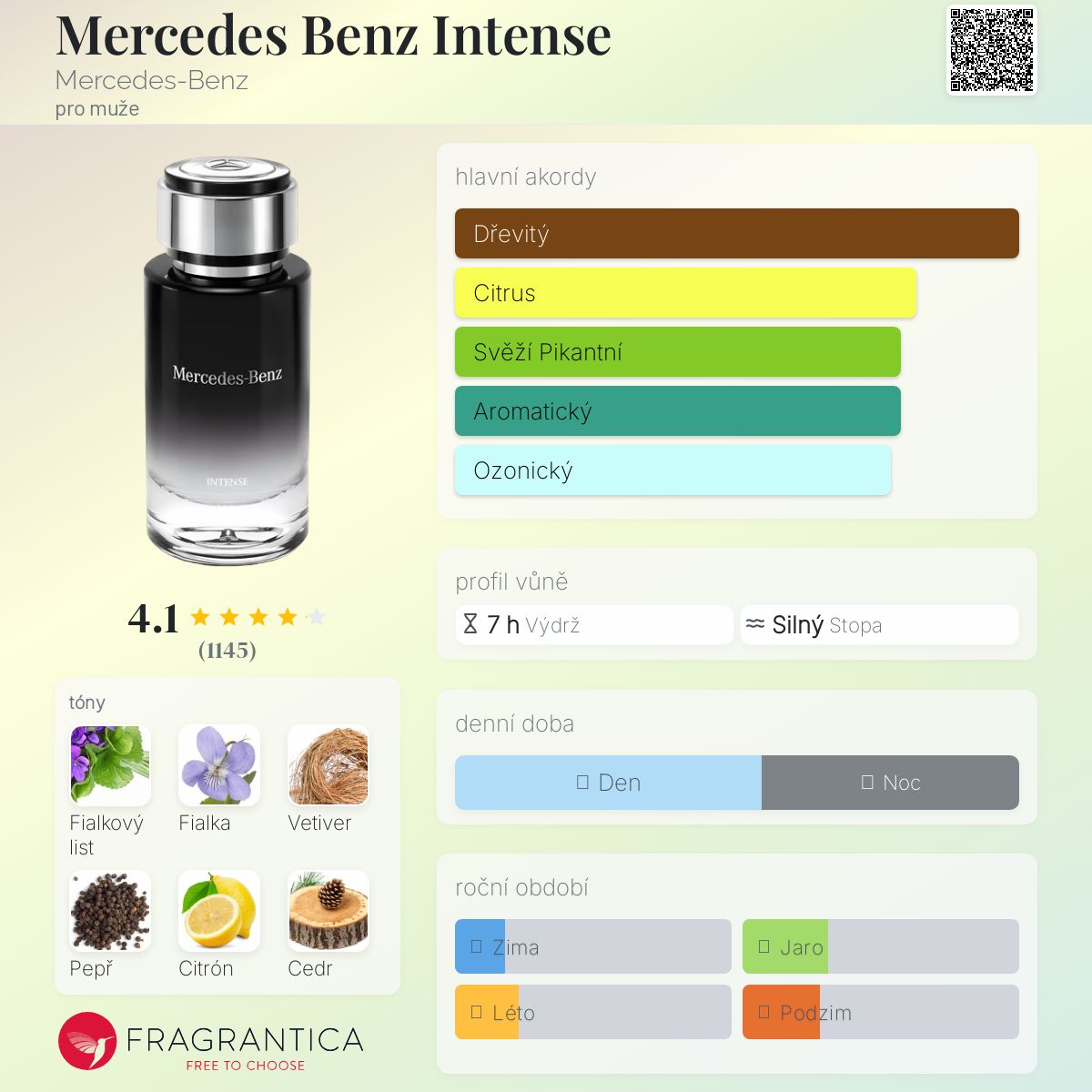 Mercedes Benz Intense podle Mercedes-Benz je Woody Spicy vůně pro muže. Mercedes Benz Intense byl/a uveden/a v roce 2013. Vrchní tóny jsou Fialkový list, Citrón, Kalábrijský bergamot a Italská mandarinka; střední tóny jsouFialka, Bourbonský pepř, Muškátový oříšek a Galbanum ; základní tóny jsou Bourbonský vetiver, Cedr, Cetalox a Pačuli.