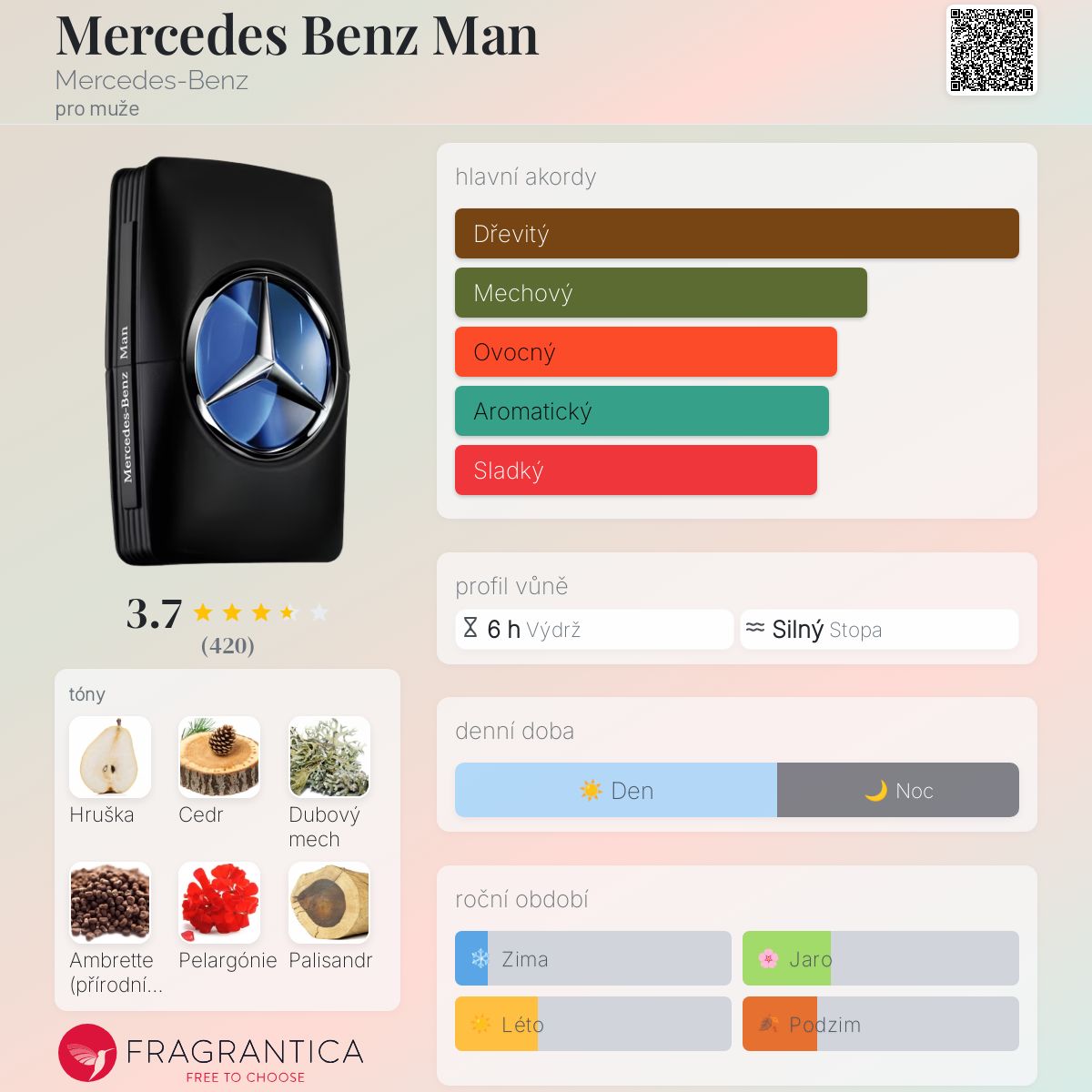 Mercedes Benz Man podle Mercedes-Benz je Aromatic vůně pro muže. Mercedes Benz Man byl/a uveden/a v roce 2015. "Nosem" za touto vůní je Olivier Cresp. Vrchní tóny jsou Hruška a Ambrette (přírodní pižmo); střední tóny jsouCedr a Pelargónie ; základní tóny jsou Dubový mech a Palisandr.