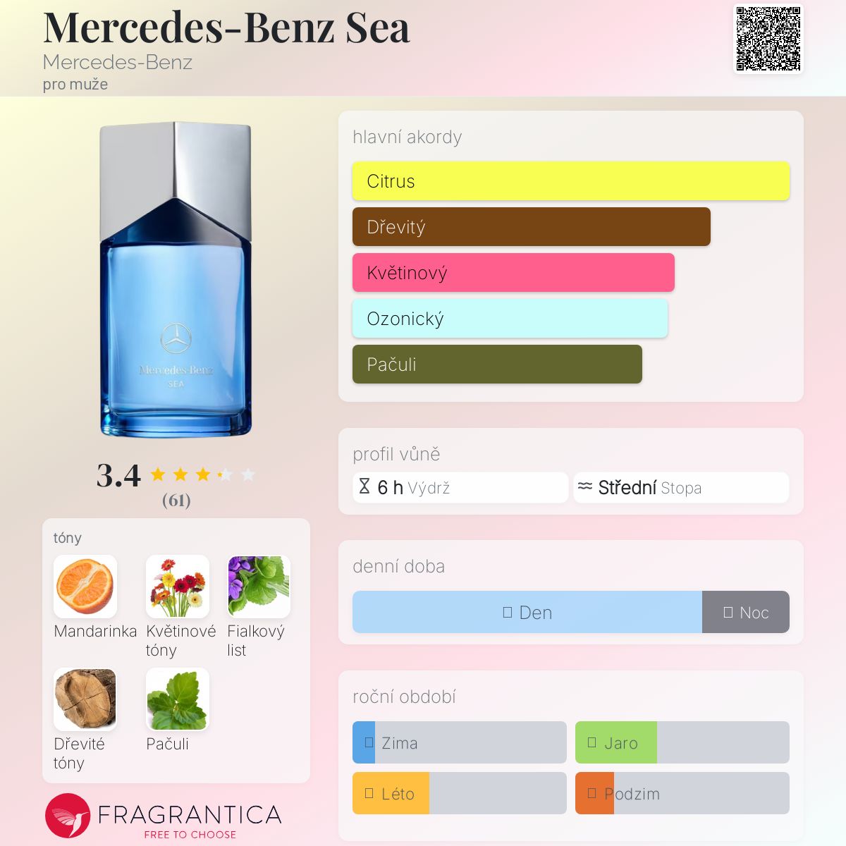 Mercedes-Benz Sea podle Mercedes-Benz je Floral Woody Musk vůně pro muže. Mercedes-Benz Sea byl/a uveden/a v roce 2023. "Nosem" za touto vůní je Anne Flipo. Vrchní tón je Mandarinka ; střední tóny jsouKvětinové tóny a Fialkový list ; základní tóny jsou Dřevité tóny a Pačuli.
