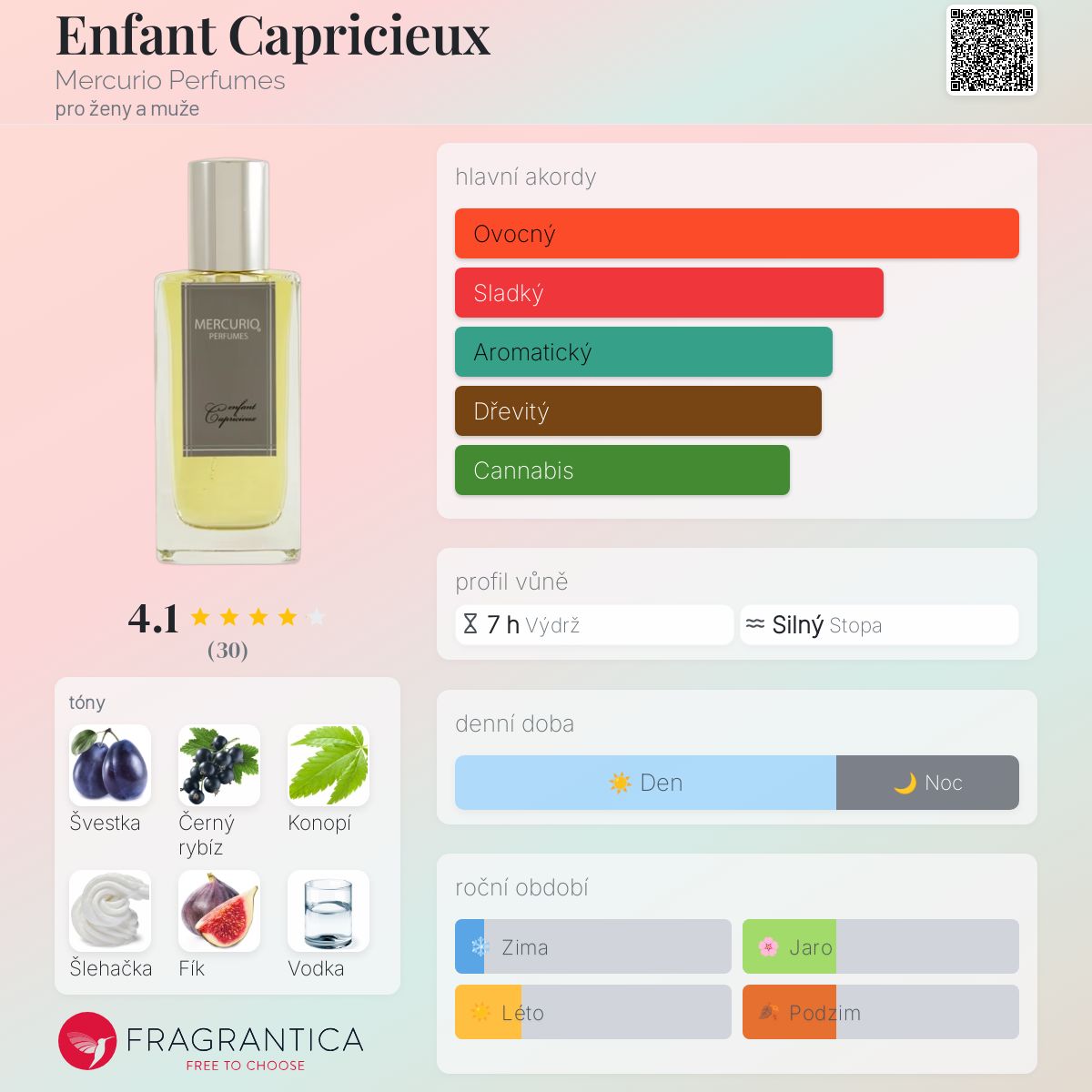 Enfant Capricieux podle Mercurio Perfumes je Floral Fruity Gourmand vůně pro ženy a muže. Enfant Capricieux byl/a uveden/a v roce 2016. "Nosem" za touto vůní je Valery Mikhalitcyn. Vrchní tóny jsou Konopí, Vodka, Borovice a Kardamom; střední tóny jsouŠvestka, Černý rybíz, Fík a Dřevité tóny ; základní tóny jsou Šlehačka, Vanilka, Jantar (ambra) a Pižmo.
