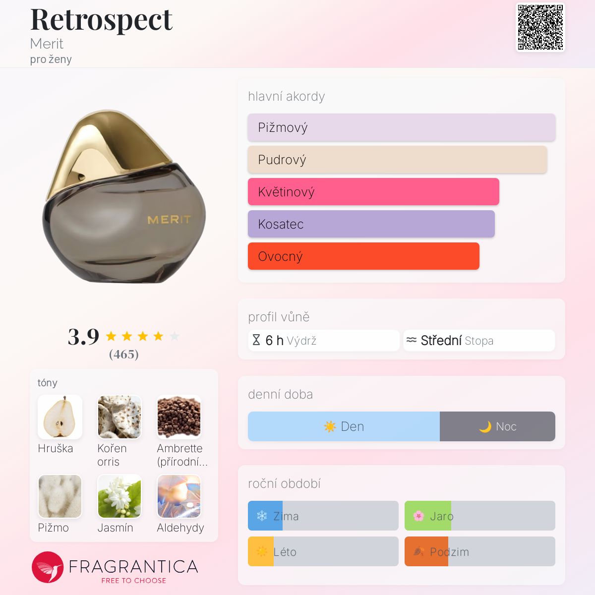 Retrospect podle Merit je Floral Fruity Gourmand vůně pro ženy. Toto je nová vůně. Retrospect byl/a uveden/a v roce 2024. "Nosem" za touto vůní je Fanny Bal. Vrchní tóny jsou Hruška, Ambrette (přírodní pižmo), Aldehydy a Bergamot; střední tóny jsouOrris, Jasmín, Fialka, Růže a Rozmarýn ; základní tóny jsou Pižmo, Mech a Vanilka.