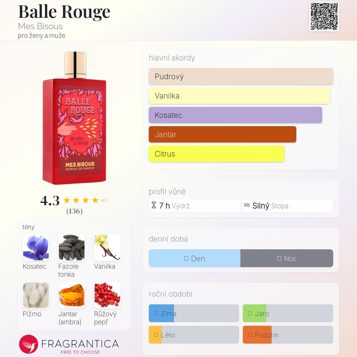 Balle Rouge podle Mes Bisous je Orientální Floral vůně pro ženy a muže. Balle Rouge byl/a uveden/a v roce 2023. "Nosem" za touto vůní je Koray Sevinç. Vrchní tóny jsou Růžový pepř, Bergamot a Citrón; střední tóny jsouKosatec, Jantar (ambra) a Růže ; základní tóny jsou Fazole tonka, Vanilka, Pižmo, Pačuli a Cedr.