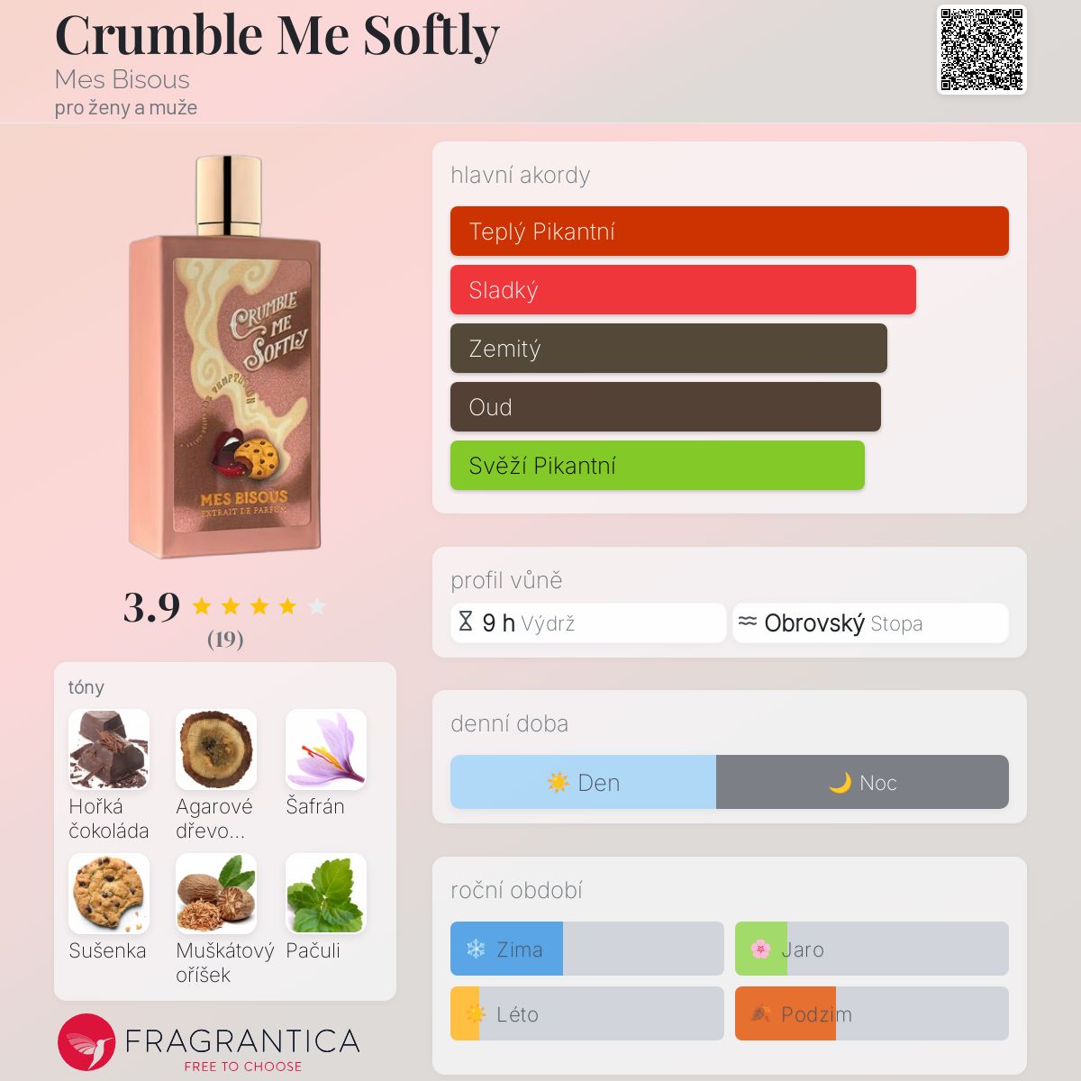 Crumble Me Softly podle Mes Bisous je Orientální Woody vůně pro ženy a muže. Toto je nová vůně. Crumble Me Softly byl/a uveden/a v roce 2025. "Nosem" za touto vůní je Ozge Erdogmus Altinel. Vrchní tóny jsou Čokoláda, Sušenka a Karamel; střední tóny jsouŠafrán, Muškátový oříšek a Levandule ; základní tóny jsou Agarové dřevo (oud), Pačuli, Cypriolový olej, Mech a Jantar (ambra).