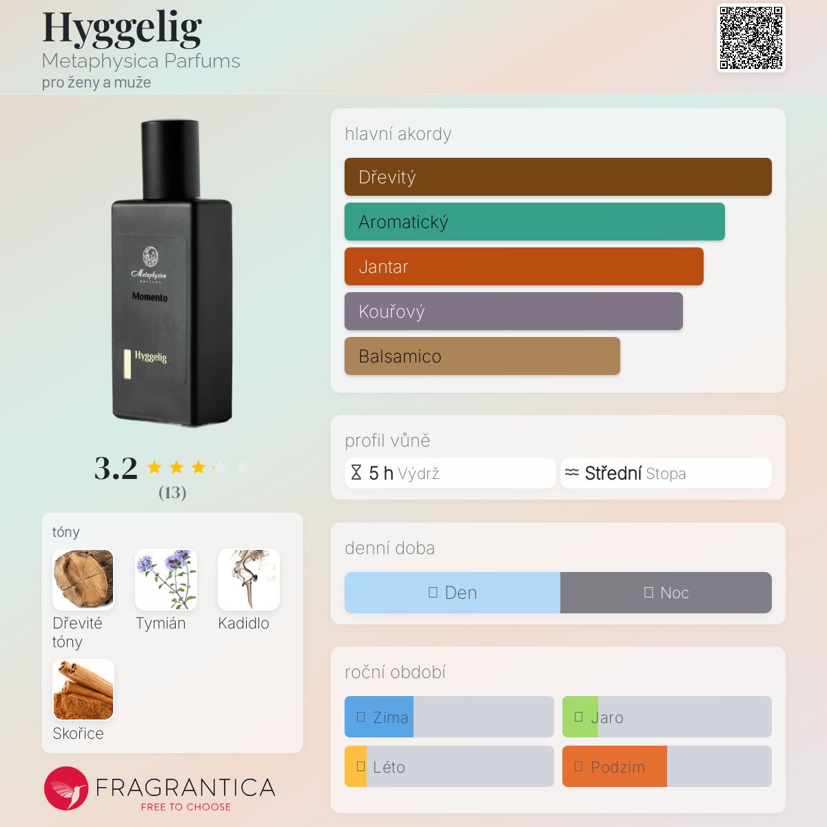 Hyggelig podle Metaphysica Parfums je Orientální Woody vůně pro ženy a muže. Hyggelig byl/a uveden/a v roce 2020. "Nosem" za touto vůní je Julia Vinogradova. Vrchní tóny jsou Tymián a Skořice; střední tón jeKadidlo ; základní tón je Dřevité tóny.