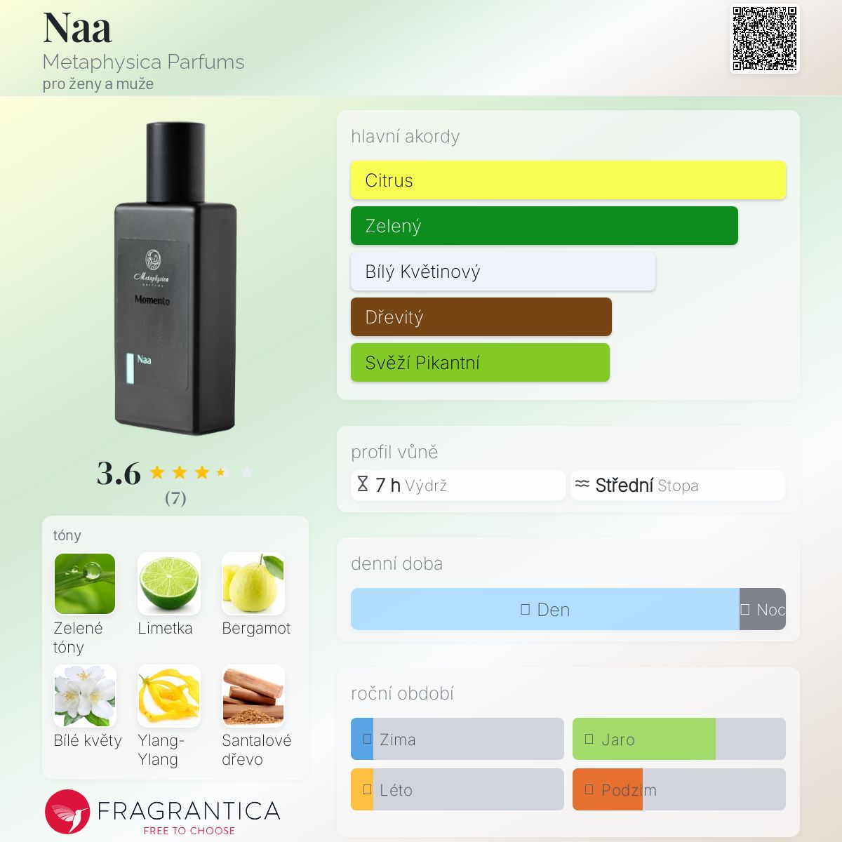 Naa podle Metaphysica Parfums je Floral Woody Musk vůně pro ženy a muže. Naa byl/a uveden/a v roce 2020. "Nosem" za touto vůní je Julia Vinogradova. Vrchní tóny jsou Limetka a Bergamot; střední tóny jsouBílé květy a Ylang-Ylang ; základní tóny jsou Zelené listí a Santalové dřevo.