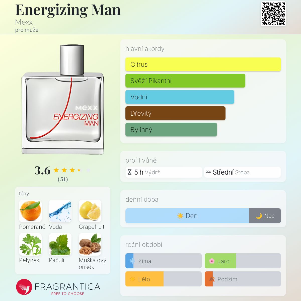 Energizing Man podle Mexx je Woody Aromatic vůně pro muže. Energizing Man byl/a uveden/a v roce 2013. Vrchní tóny jsou Pomeranč, Vodnaté tóny a Grapefruit; střední tóny jsouPelyněk, Muškátový oříšek a Cedr ; základní tóny jsou Pačuli, Pižmo a Jantar (ambra).