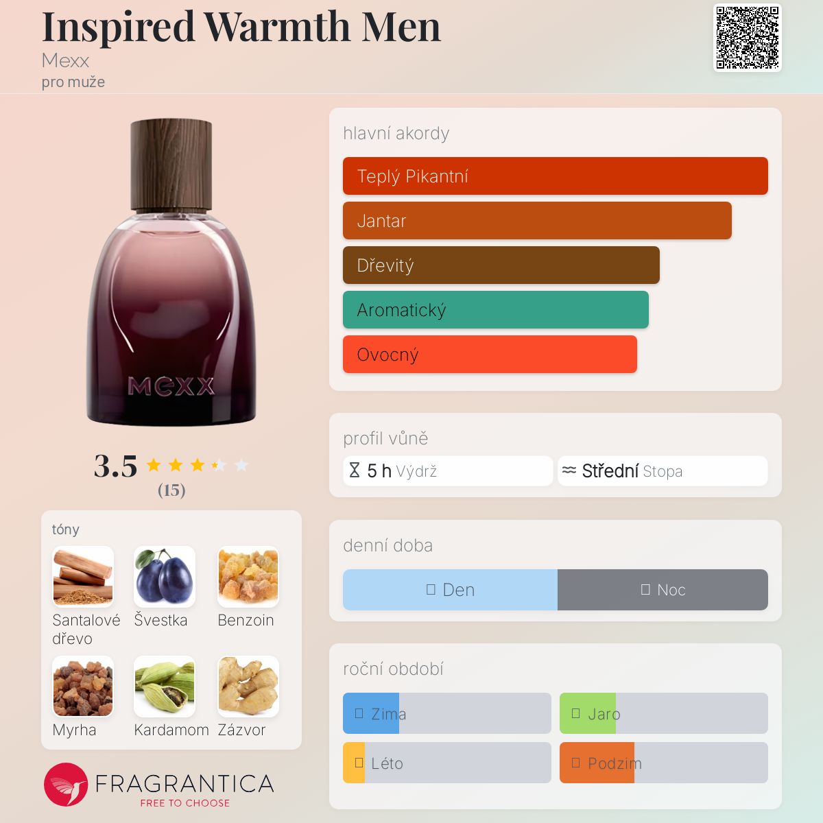 Inspired Warmth Men podle Mexx je Woody Spicy vůně pro muže. Toto je nová vůně. Inspired Warmth Men byl/a uveden/a v roce 2025. Vrchní tóny jsou Kardamom, Bergamot a Zázvor; střední tóny jsouPelargónie, Absint a Švestka ; základní tóny jsou Santalové dřevo, Benzoin a Myrha.