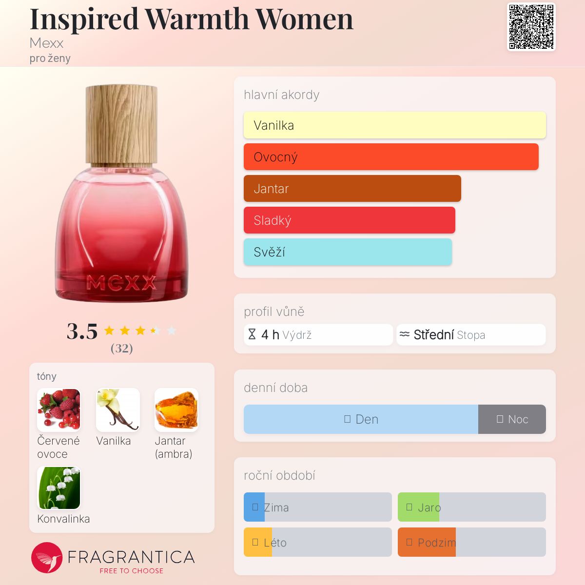 Inspired Warmth Women podle Mexx je Orientální Vanilla vůně pro ženy. Toto je nová vůně. Inspired Warmth Women byl/a uveden/a v roce 2025. Vrchní tón je Červené ovoce ; střední tón jeKonvalinka ; základní tóny jsou Vanilka a Jantar (ambra).