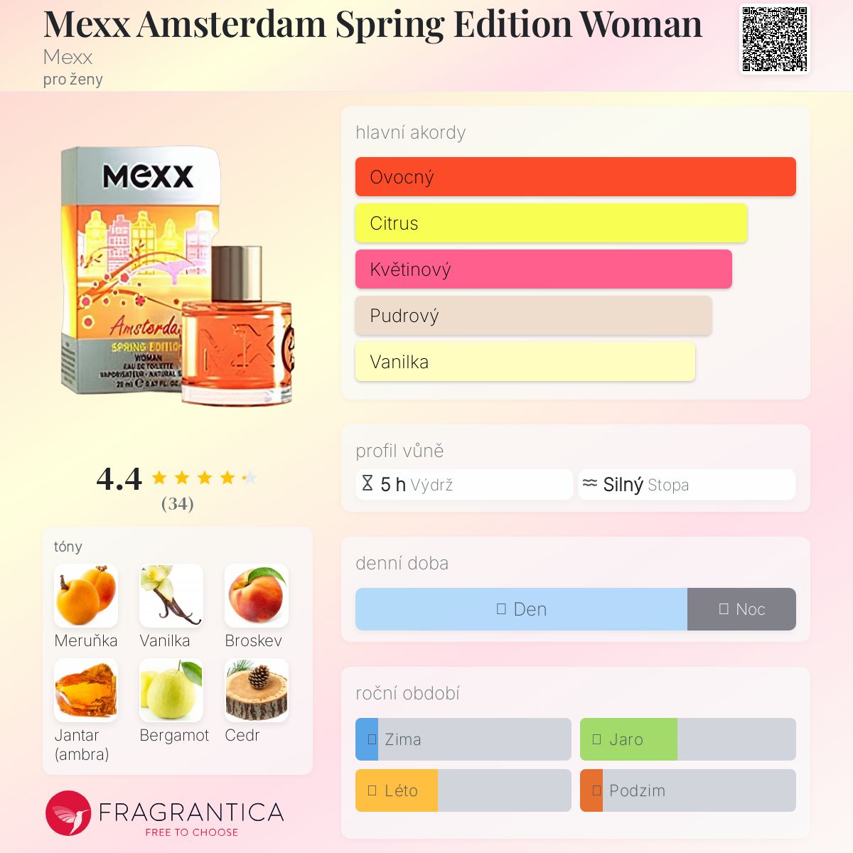 Mexx Amsterdam Spring Edition Woman podle Mexx je Floral Fruity vůně pro ženy. Mexx Amsterdam Spring Edition Woman byl/a uveden/a v roce 2007. Vrchní tóny jsou Broskev, Bergamot, Frézie a Citrón; střední tóny jsouMeruňka, Jasmín, Magnólie, Jablko a Růže ; základní tóny jsou Vanilka, Jantar (ambra) a Cedr.