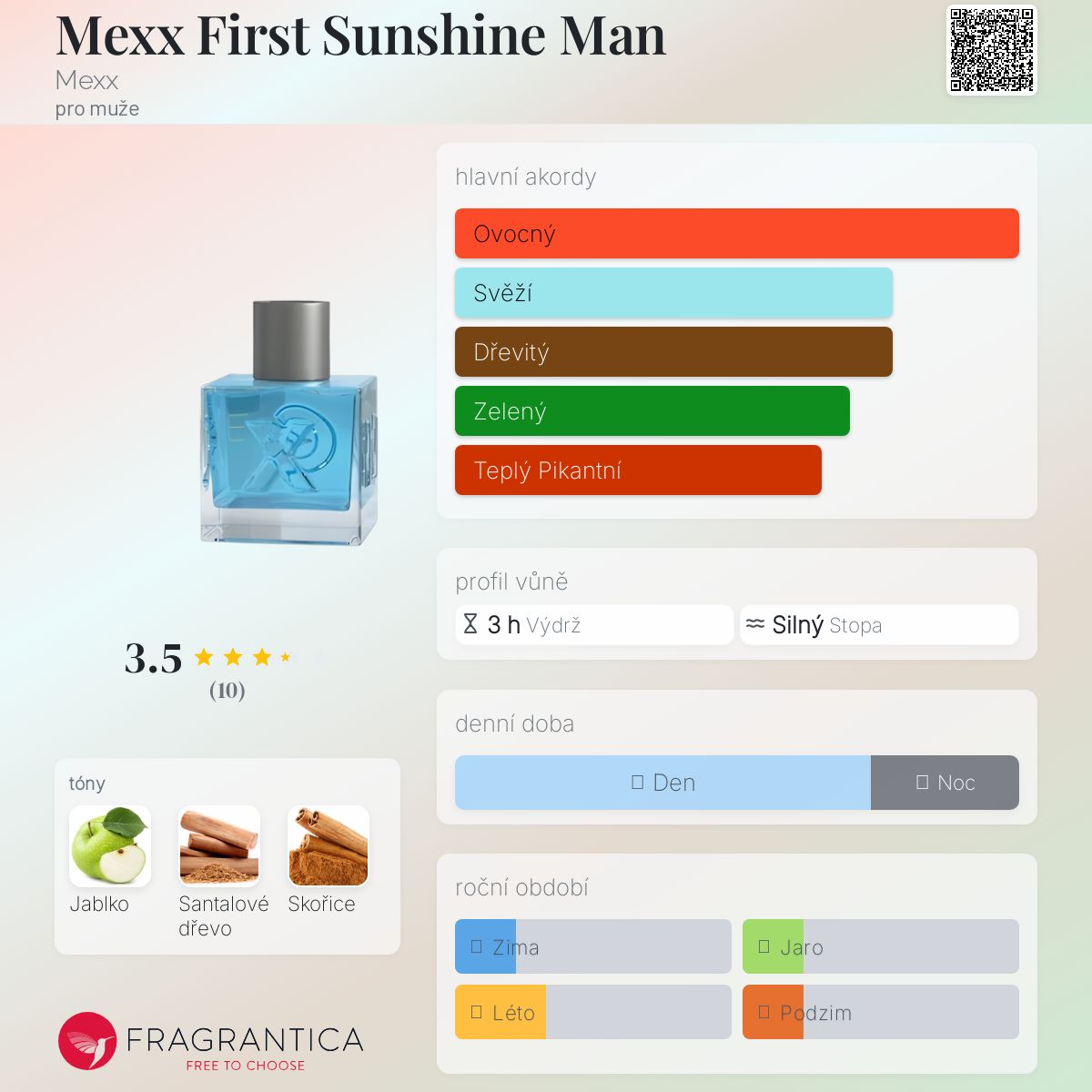 Mexx First Sunshine Man podle Mexx je vůně pro muže. Mexx First Sunshine Man byl/a uveden/a v roce 2010. Vrchní tón je Granny Smith jablko ; střední tón jeSkořice ; základní tón je Santalové dřevo.