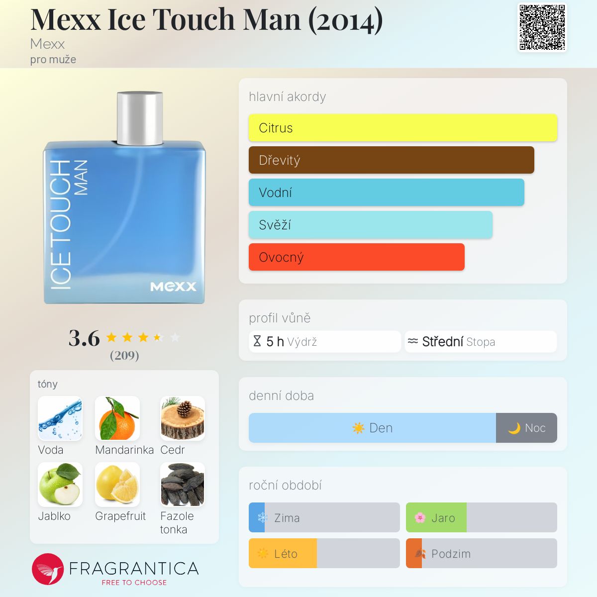 Mexx Ice Touch Man (2014) podle Mexx je Woody Aquatic vůně pro muže. Mexx Ice Touch Man (2014) byl/a uveden/a v roce 2014. Vrchní tóny jsou Růžový grapefruit, Zelené jablko a Mandarinka; střední tóny jsouVodní tóny, Cedr a Jasmín ; základní tóny jsou Fazole tonka, Santalové dřevo, Pačuli a Jantar (ambra).
