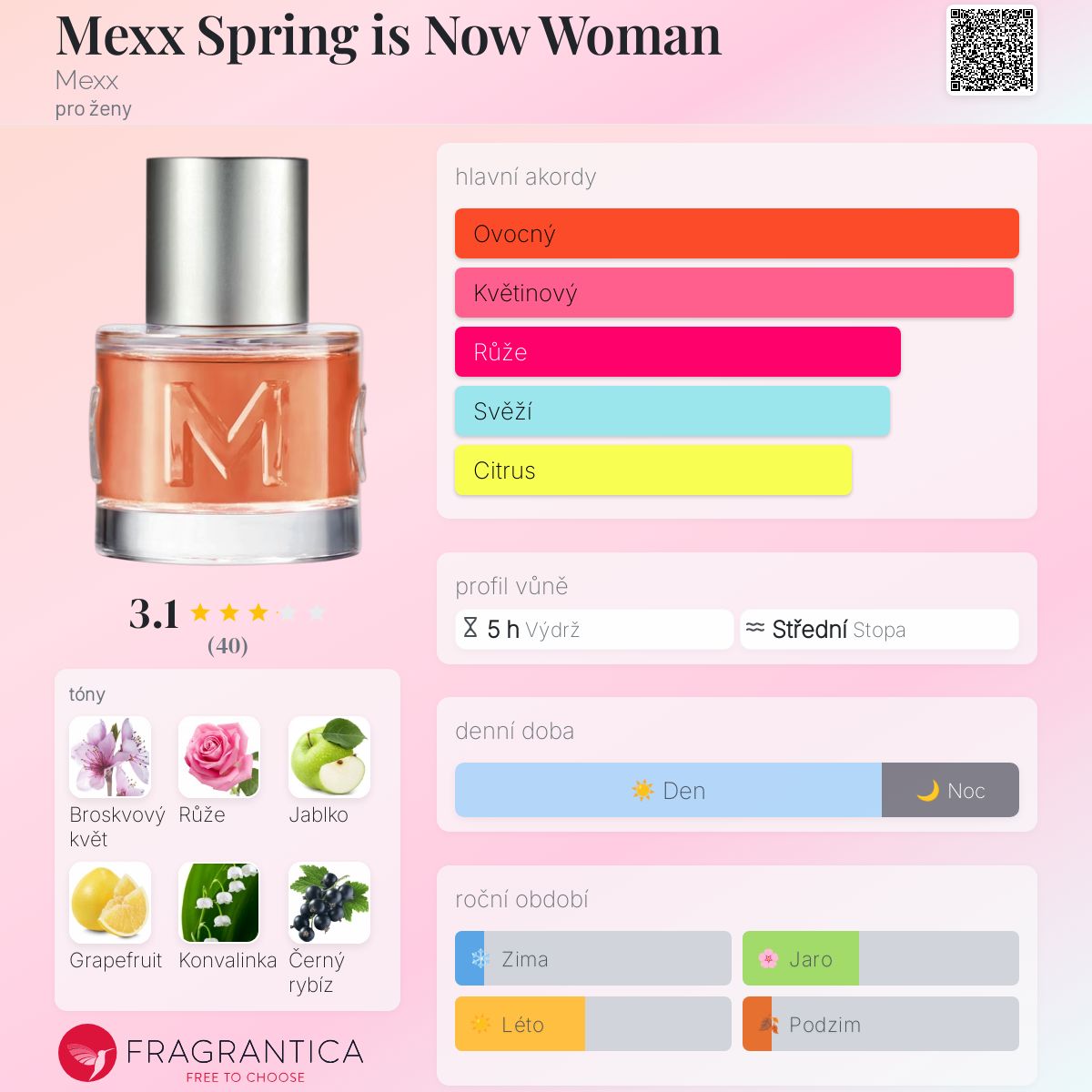 Mexx Spring is Now Woman podle Mexx je Floral Fruity vůně pro ženy. Mexx Spring is Now Woman byl/a uveden/a v roce 2015. Vrchní tóny jsou Jablko, Grapefruit a Černý rybíz; střední tóny jsouRůže a Konvalinka ; základní tóny jsou Broskvový květ a Brazilské růžové dřevo.