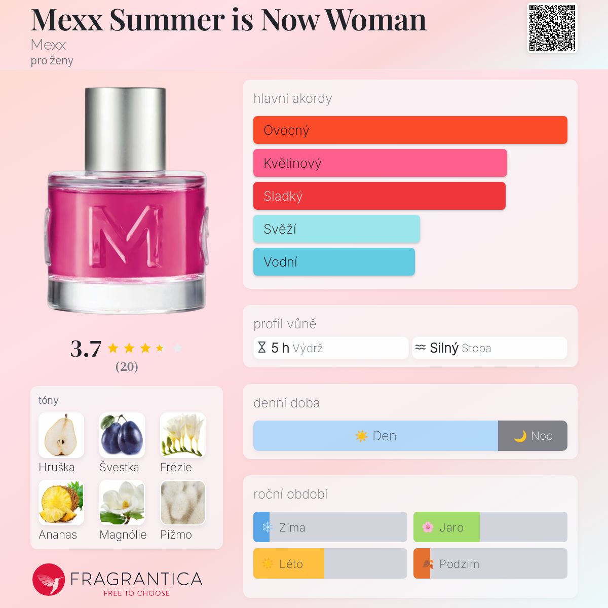 Mexx Summer is Now Woman podle Mexx je Floral Fruity vůně pro ženy. Mexx Summer is Now Woman byl/a uveden/a v roce 2016. Vrchní tóny jsou Hruška a Ananasový list; střední tóny jsouŠvestka mirabelka, Frézie a Magnólie ; základní tóny jsou Pižmo a Santalové dřevo.