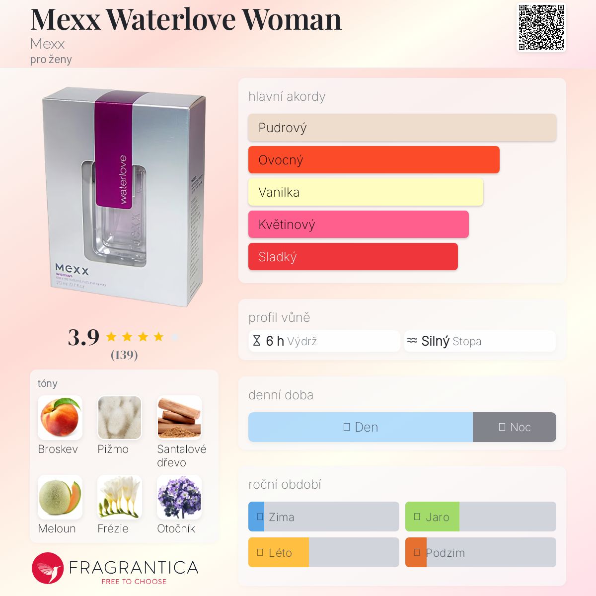 Mexx Waterlove Woman podle Mexx je Floral Fruity vůně pro ženy. Mexx Waterlove Woman byl/a uveden/a v roce 2004. "Nosem" za touto vůní je Nathalie Lorson. Vrchní tóny jsou Bílá broskev, Meloun a Meruňka; střední tóny jsouFrézie, Otočník a Konvalinka ; základní tóny jsou Bílé pižmo, Santalové dřevo, Fazole tonka a Vanilka.