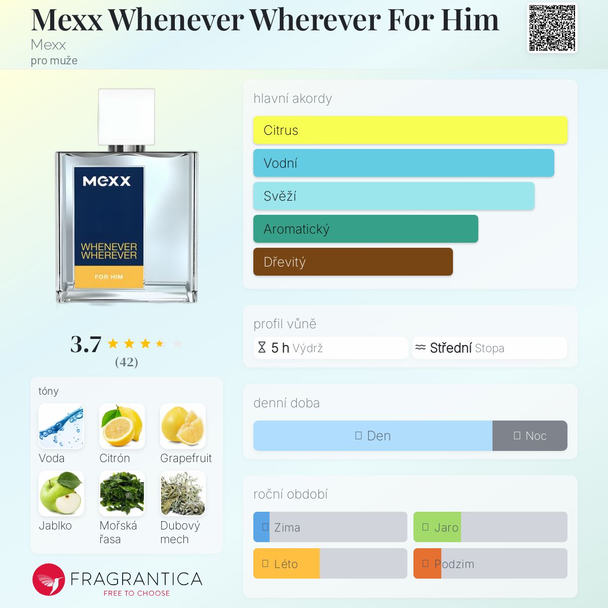 Mexx Whenever Wherever For Him podle Mexx je Woody Aromatic vůně pro muže. Mexx Whenever Wherever For Him byl/a uveden/a v roce 2019. Vrchní tóny jsou Citrón, Grapefruit, Jablko a Břečťan; střední tóny jsouVodní tóny, Mořská řasa a Jedlová pryskyřice ; základní tóny jsou Dubový mech, Kašmír a Pačuli.