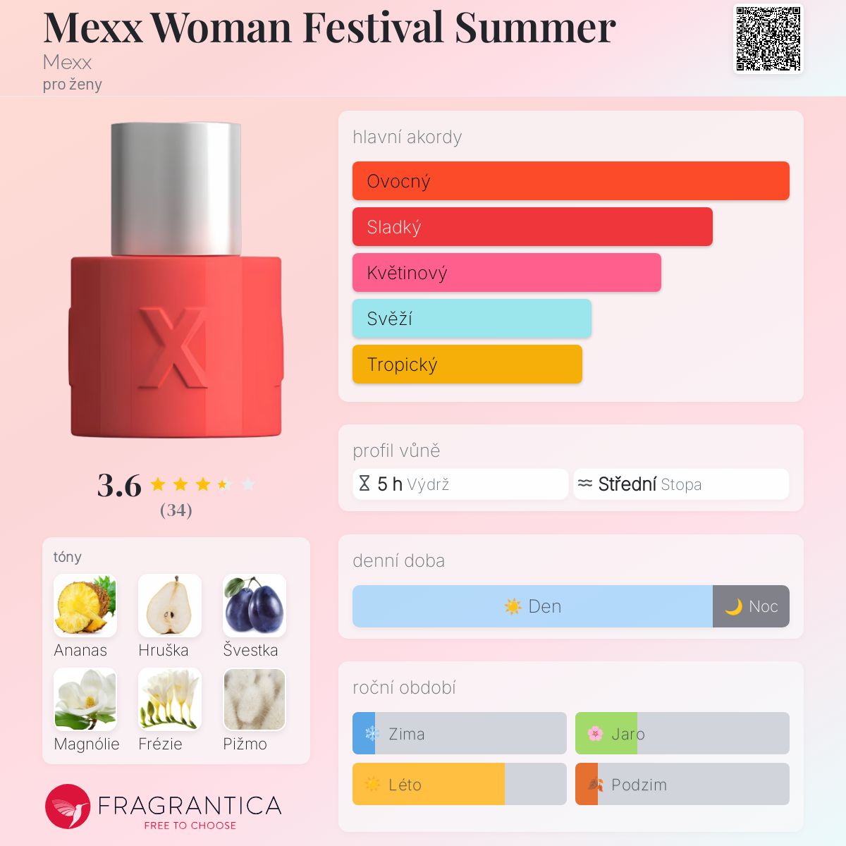 Mexx Woman Festival Summer podle Mexx je Floral Fruity vůně pro ženy. Mexx Woman Festival Summer byl/a uveden/a v roce 2018. Vrchní tóny jsou Ananasový list a Hruška; střední tóny jsouŠvestka mirabelka, Magnólie a Frézie ; základní tóny jsou Pižmo a Santalové dřevo.