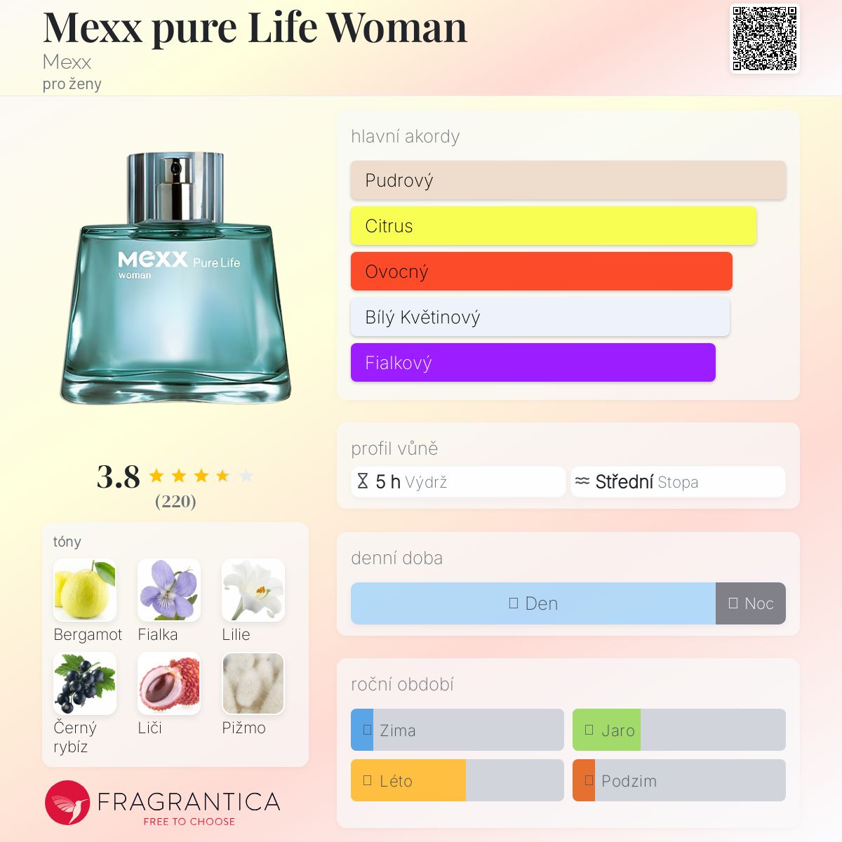 Mexx pure Life Woman podle Mexx je Floral Fruity vůně pro ženy. Mexx pure Life Woman byl/a uveden/a v roce 2003. Vrchní tóny jsou Bergamot, Černý rybíz a Liči; střední tóny jsouFialka, Lilie a Jasmín ; základní tóny jsou Pižmo, Otočník a Jantar (ambra).