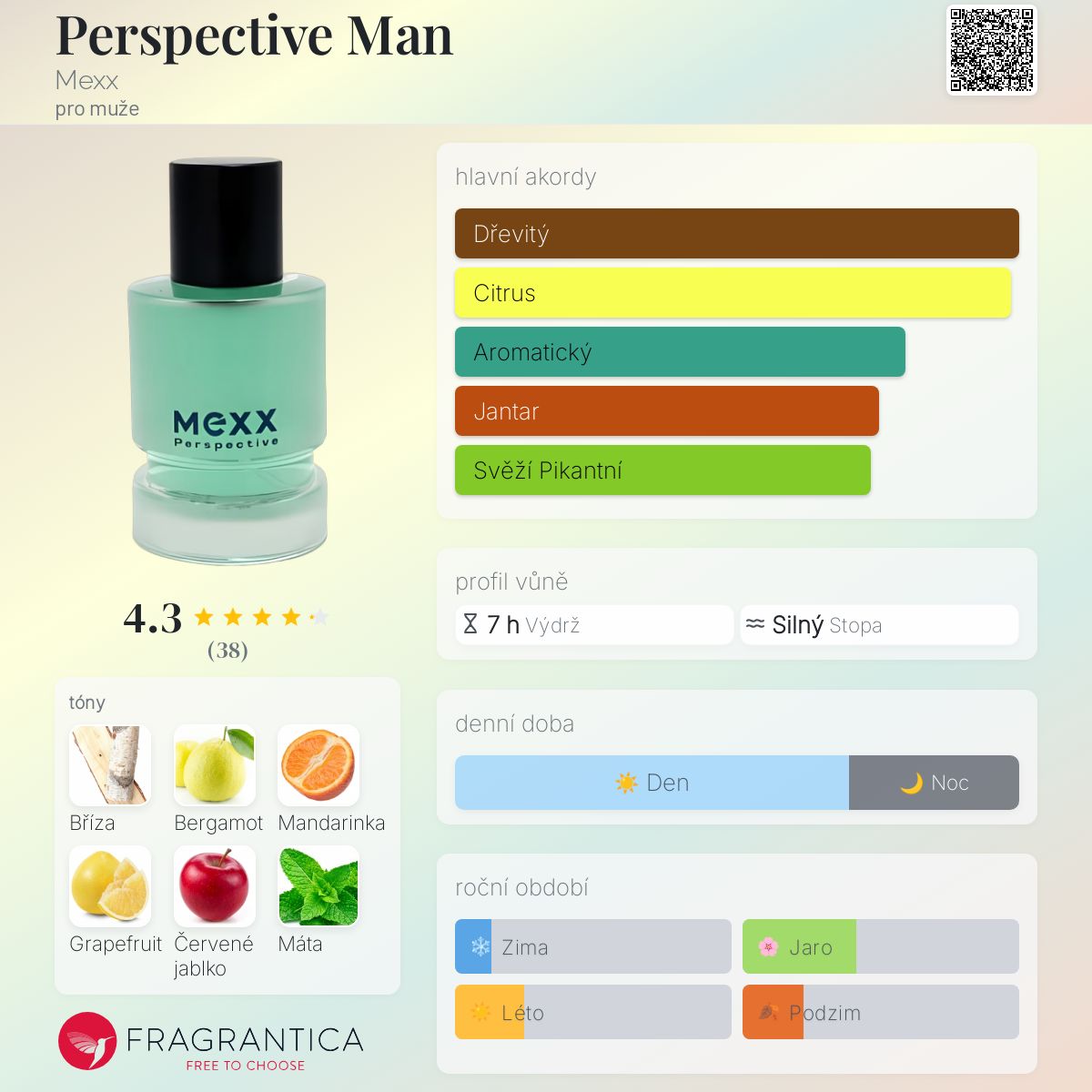Perspective Man podle Mexx je Aromatic Fougere vůně pro muže. Perspective Man byl/a uveden/a v roce 2001. Vrchní tóny jsou Bříza, Bergamot, Mandarinka, Grapefruit, Červené jablko, Francouzské labdanum a Ananas; střední tóny jsouMáta, Pepř, Leknín a Šalvěj muškátová ; základní tóny jsou Santalové dřevo, Virginský cedr, Jantar (ambra), Fazole tonka, Pižmo, Vetiver, Dubový mech, Týkové dřevo a Andělika.